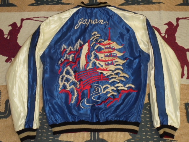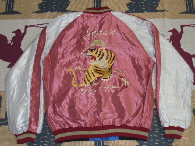 終戦後の混沌とした中で誕生した刺繍入りジャンパー。これらはそもそも日本に進駐したアメリカ軍兵士達のお土産物でした。彼等はオリエンタルなデザインのものを好み、露天に並ぶ和装小物や雛人形等が状態を問わず飛ぶように売れていた為、そこに目を付けた者がいました。当時は統制物資となっていたシルクに良く似た素材、アセテートに桐生の刺繍職人が鷲や虎、龍などの刺繍を施して進駐軍が集まるエリアの露天に並べたのです。この鷲、虎、龍の刺繍ジャンパーはやがて進駐軍の基地の購買部担当者の目を引き、そこで取り扱われるようになったのです。これが後にスカジャン(スーベニールジャケット)と呼ばれるジャケットの始まりです。そしてこの刺繍ジャンパーを考え出した者こそ、現在テーラー東洋ブランドでスカジャンを作っている、東洋エンタープライズの前身の港商商会の創始者です。