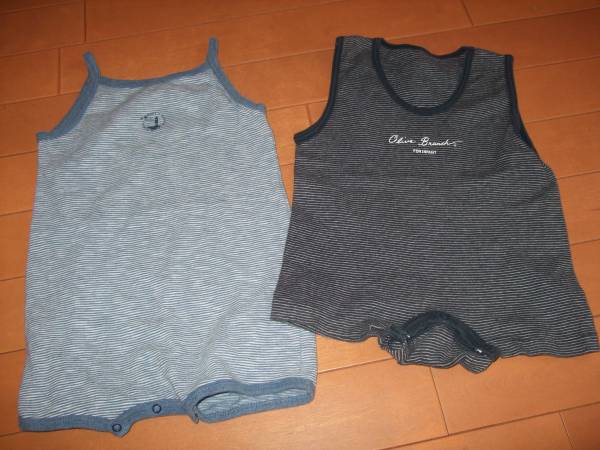 ユーズド品、ベビー、男の子向きのつなぎ、夏用です。キャミタイプのものがサイズ80、半袖がサイズ70です。どちらもコットン100で、ノーブランドのものですが、上品でシンプルなデザインなので、お着換え用に重宝するようなタイプのものです。ユーズド品ですので、毛羽立ち等はありますが、ベビーカーでのお出かけ時にも問題なく外出いただける範囲のものです。即決です。。