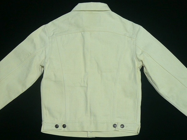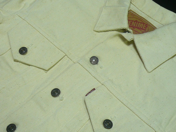 | 未使用品。「DENIME」ドゥニームの生成りの生デニムを使用したデニムジャケット「557XX サード」タイプのサイズ38(SMALL相当)になります。カード・ラベル仕様の未染織の糸を織りあげた生成りデニムを使用しオフ・ホワイトのステッチで縫い上げたオリジナル・デニム・ジャケットになります。カラーは生成りのオフ・ホワイトで糊付き未洗いのリジッドの状態になります。LEVISの60年代の名品デニムジャケット「557XX]を生デニムで再現したモデルでボディーにフィットする立体裁断がなされたタイト・シルエット(タイト&ショート)、両胸にフラップ付きポケット、サイドアジャスト・ボタンと現在市販されているデニムジャケットのルーツともいえる完成されたデザインの60年代中期のサード・モデルのデザインをDENIME独自の未染織糸を織りあげたオリジナル・デニムで忠実に再現されています。「DENIME」表記の両面レッドタブ。「DENIME」のオリゾンティ時代に製作された素材と縫製に拘った完成度の高いサード・デザインにまとまっています。状態は未使用品で糊付きのリジッドの状態のままのデッド・ストック品になります。白地の薄色のため保管時のホコリ移りや糊スレなどはあると思いますが保管時のシミやヨゴレなどは無く古いものですが非常に良い状態になると思います。実寸は肩幅(直線で)約46cm、身幅(腋下で)約50cm、着丈(衿下より)約56.5cm、袖丈約67cmとなります。(素人採寸ですので多少の誤差はお許し下さい。サイズ表記は38ですがリジッドの状態で洗濯後に縮みが出ます。ワンサイズ小さくお考えください。)素材表記は綿100%、日本製。「DENIME」の親会社の再編以前のオリゾンティ時代に製作されたモデルの未使用品で現在では入手が不可能な非常にレアなモデルになると思います。 | |||