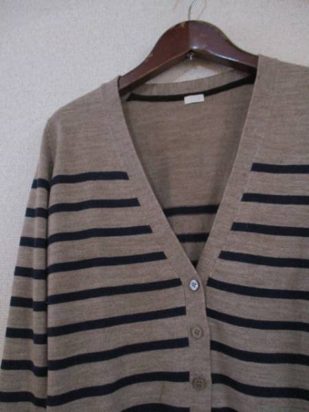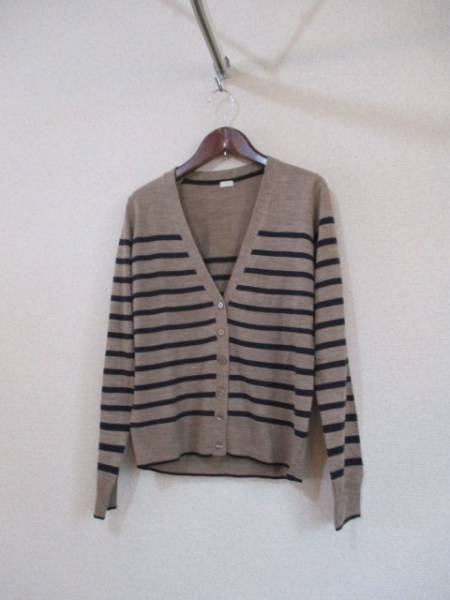 商品紹介 | 濃いめのベージュにネイビーのラインが入ったボーダーカーディガンです。 Vネックのシンプルな形です。 袖口と裾のラインは黒です。 《素材》 アクリル100% |