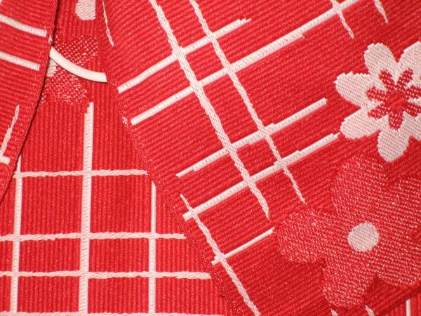 女性yukata用、地紋柄結び帯  あか ポリエステル  新品(織り地紋柄ありです。波状の写りはレンズの光学的ないたずらで現品にはありません、また薄く濃く写っている場合もあります)、胴部--帯巾約17,0cmx長さ約130cm、リボン部は横に約30cm。見た範囲で汚れないと思いますが、着用に差し支えない薄汚れ(多分ない?)はあってものお値段で出品です。