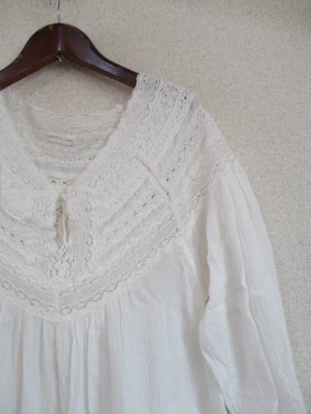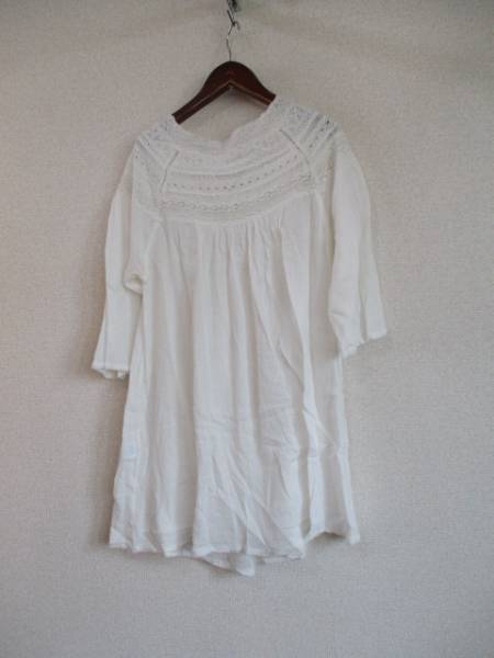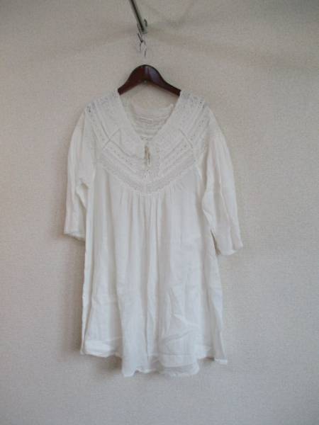 | 商品紹介 | 襟周りにレースをたっぷり使った7分袖チュニックまたはミニワンピースです。 襟中央は10cm位開いていて、上をひもでリボン結びするデザインです。 本体は少しシワ加工になったガーゼ素材のような生地で着心地が良いです。 色は白です。 《素材》 本体・レース:綿100% |