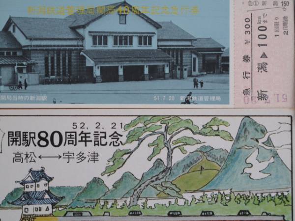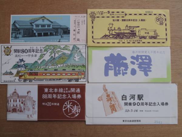 昭和50年から同53年に発行された、国鉄 開駅90周年など 記念切符 6種 22枚 袋入り です。 ① 昭和50年12月に発行された、東北本線 上野ー塩釜間 開通88周年 記念入場券 4枚袋入りです。仙台鉄道管理局発行。機関車と駅舎のモノクロイラストが使われています。裏面に年表。 ② 昭和51年7月20日に発行された、新潟鉄道管理局 開局40周年 記念急行券 です。新潟鉄道管理局発行。開局当時の新潟駅舎の写真が使われています。裏面に説明文。 ③ 昭和52年2月21日に発行された、高松ー宇多津 開駅80周年 記念券です。四国総局発行。列車と讃岐名所のカラーイラストが使われています。裏面に説明文。 ④ 昭和52年7月16日に発行された、白河駅開業90周年 記念入場券 5枚袋入りです。東京北鉄道管理局発行。駅舎と特急と沿線名所のカラー写真が使われています。裏面に説明文。 ⑤ 昭和52年9月15日に発行された、藤沢駅 開業90周年 記念入場券 5枚袋入りです。東京南鉄道管理局発行。古い駅舎と名所のカラーイラストが使われています。裏面に説明文。 ⑥ 昭和53年7月16日に発行された、旭川駅・開駅80周年記念入場券 5枚袋入りです。旭川鉄道管理局発行。新旧列車と駅舎の写真が使われています。裏面に説明文。 サイズは①の袋がタテ7.0cm×ヨコ15。5cm、②が5.9cm×15.4cm、③が8.0cm×17.5cm、④の袋が8.0cm×18.0cm、⑤の袋が7.3cm×16.3cm、⑥の袋が7.5cm×16.5cm。 ①の袋内部に薄い小シミ・本券に小折れシワと上端の極小傷み、②の一部に小折れシワ、⑤の袋の一部に薄い小シミ・本券裏面の一部に薄い小シミがあります。③④⑥は美品です。 定形外郵便180円でお送りします。 ★保存状態の記述は、あくまで出品者の主観的な評価ですので、保存状態にきびしい方は、入札をご遠慮願います。