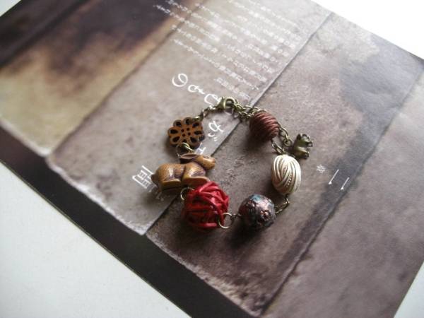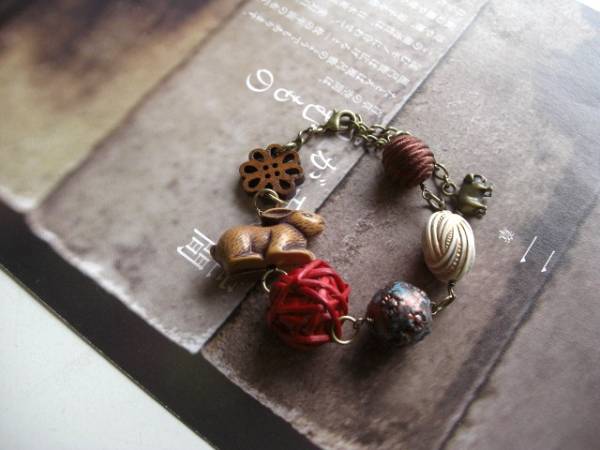 女の子スタイル・・シリーズです♪アリスの時間・・個性的な異素材を集めて楽しいブレスレットです♪14ミリから25ミリ位までの麻ビーズやサテンビーズやウッドの透かしフラワーやドイツビーズや樹脂ビーズや竹ボール、樹脂のうさぎさんを集めました♪シックな色でまとめてロマンチックな表情です♪長さは全長23センチ位で調節自由です♪お揃いのネックレスも出品しています♪シンプルで飽きのこないいつまでも着けられるデザインを考えて作りました♪ハンドメイドをご理解頂いてノークレーム、ノーリターンでお願いします