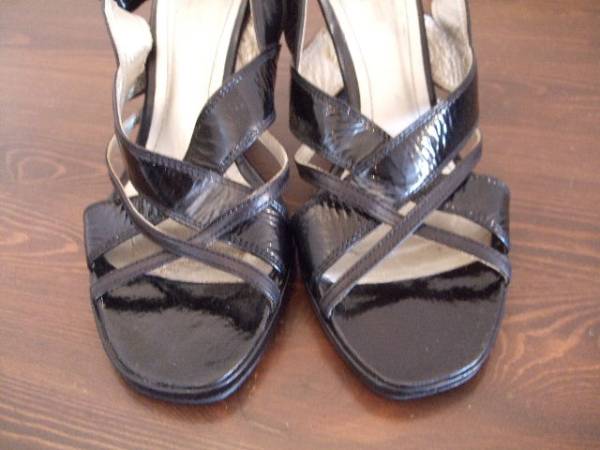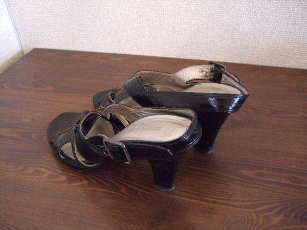 商品紹介 | 黒×シルバーの配色が可愛いです。 黒部分の素材はエナメルなので光沢感があります。 かかとのベルト調整可能です。 |