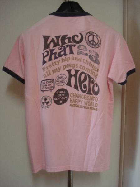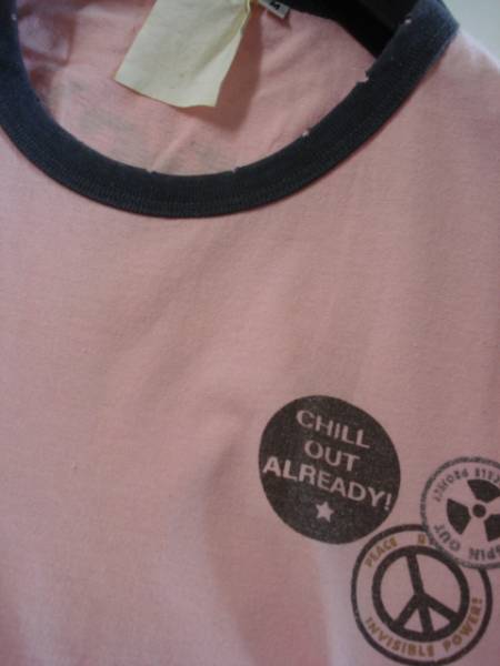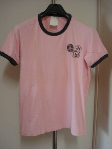 格安レトロビンテージ系廃版レアモデル・ブランド未読品・ピンク系ダメージ加工地・両面プリント入り・半袖丸首系リンガーTシャツ Mになります。