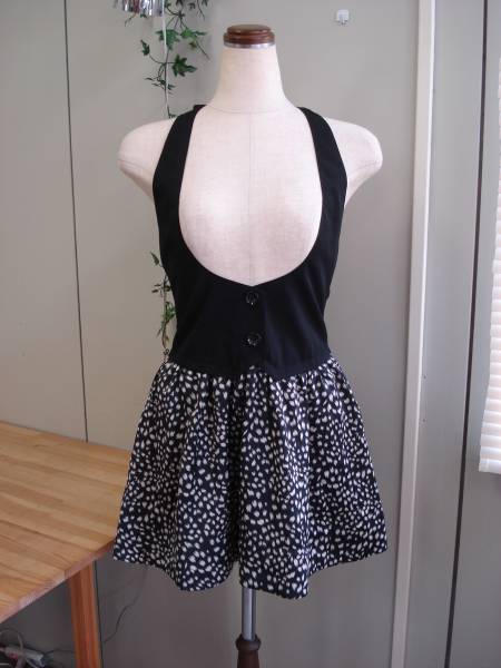 ブラックのホルターネックのベストとブラック×べージュの柄スカートの組み合わせが可愛いワンピです。