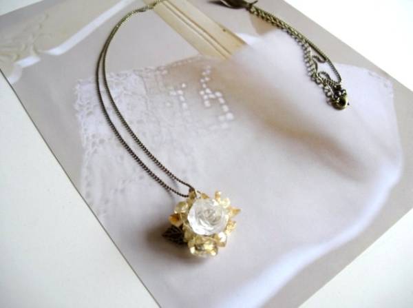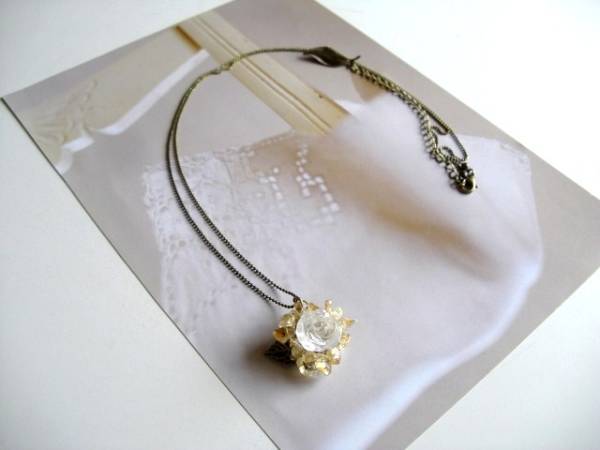 儚さを重ねて・・シリーズです♪妖精の涙・・繊細なシトリンのネックレスです♪シトリンのさざれに水晶の薔薇や葉っぱのチャームをシャワーヘッドに編みこんで可憐な表情です♪7ミリから11みり位までのシトリンに15ミリの水晶の薔薇を合わせました♪長さは77センチ+アジャスター10センチで最長87センチ位です♪トップは3センチ位です♪お揃いのピアスも出品しています♪シンプルで飽きのこないいつまでも着けられるデザインを考えて作りました!ハンドメイドをご理解頂いてノークレーム、ノーリターンでお願いします