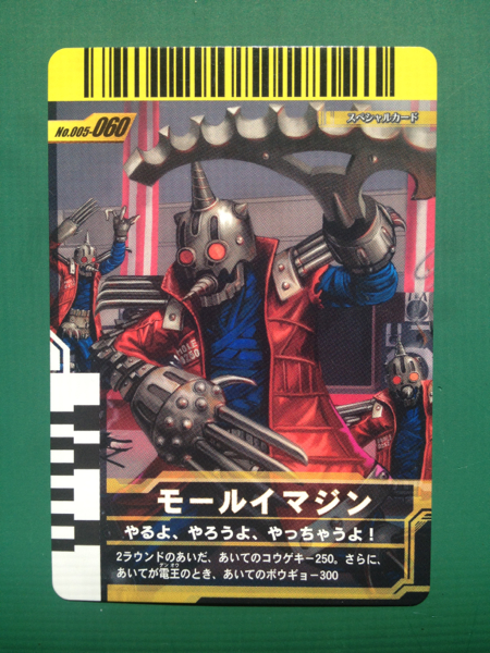 仮面ライダー、ガンバライドの第005弾からスペシャルカード、No.060《モールイマジン》の登場です。発送は、普通郵便を利用します。(特にご希望のない場合)おとりまとめも可能ですが、送料に変動する場合がございます。また、送料のご請求は、自宅での計量を基準にご請求させていただいておりますので、実際の金額と差異が出る場合もございます。予めご了承ください。他にも多数出品中です。まとめてこの機会にいかがでしょうか?ご質問お待ちしております。