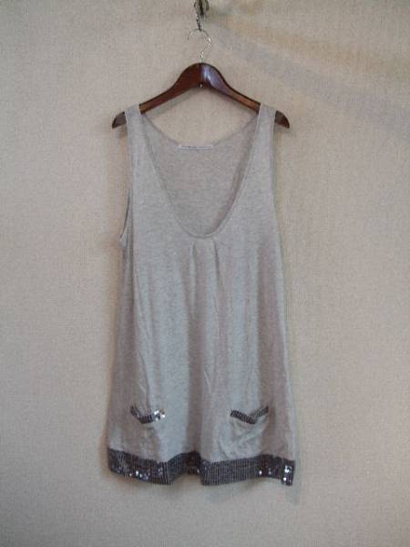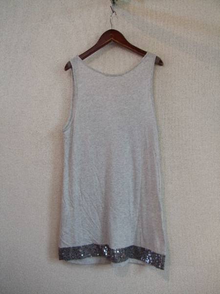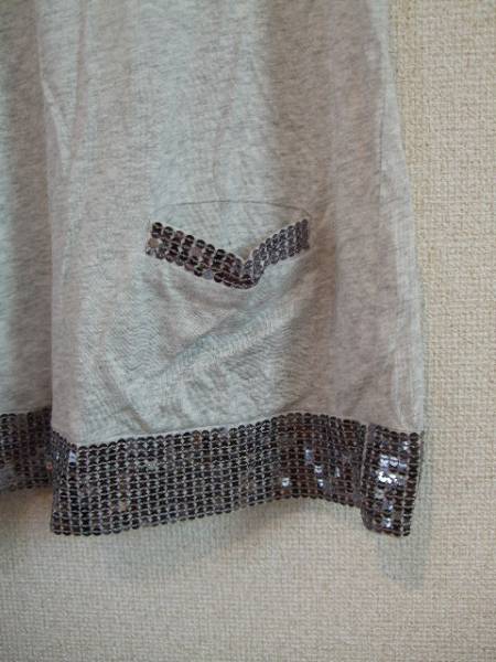 | 商品紹介 | 裾とポケットにスパンコールが付いたオシャレなタンクトップチュニックです。 襟元はやや広く開いていて、ほぼストンとした形です。 色はライトグレーで、カットソー素材です。 《素材》 コットン50% レーヨン50% |