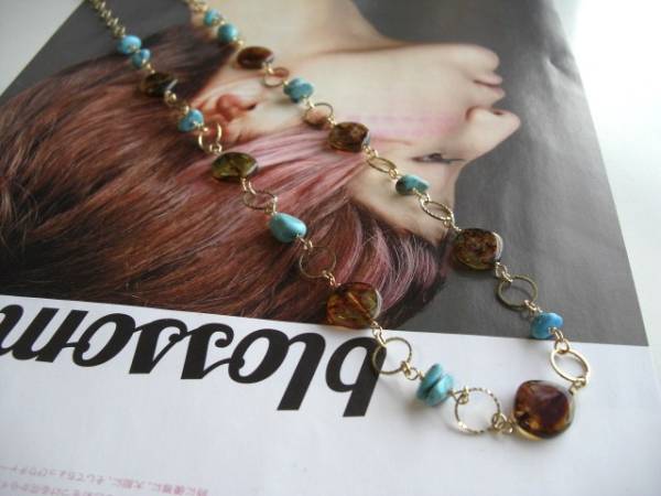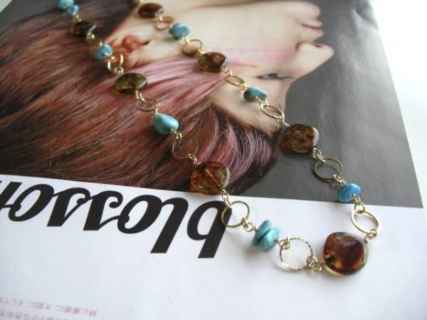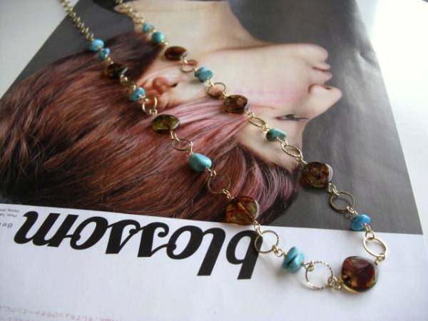 ニューヨーク・テイスト・・シリーズです♪春色・レシピ・・シックなブルーグリーンのターコイズのネックレスです♪オーバルのターコイズにチェコビーズを合わせてキュートな表情です♪10×8ミリのオーバルやさざれのターコイズは琥珀色のチェコビーズやデザインチェーンを合わせました♪長さは全長82センチ位で調節自由です♪お揃いのネックレスやブレスレットやピアスも出品しています♪シンプルで長く着けていただけるデザインを考えて作りました♪ハンドメイドをご理解頂いてノークレーム、ノーリターンでお願いします