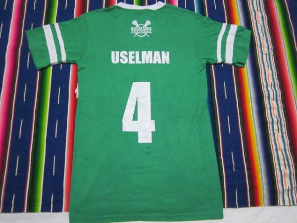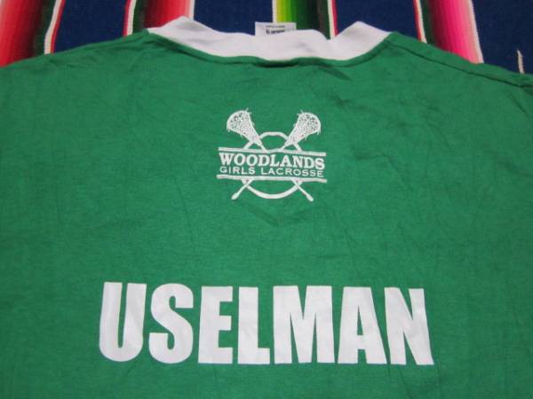 アメリカンカジュアルらしい、風合い有る原色グリーンの発色、ナンバリングやチームロゴ、バックネックのクロス ラクロススティック エンブレムデザインの入り方が極めて良い感じ