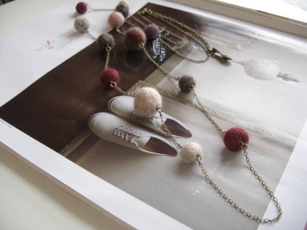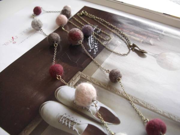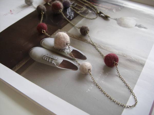 魔法にかけられて・・シリーズです♪秋色の巴里・・ふんわりやさしいフェルト玉のネックレスです♪モーヴピンクやグレー、モスブラウンやベージュなどシックな色のフェルト玉を集めて合わせてキュートな表情です♪フェルト玉は10ミリから18ミリ位までの大きさ違いです♪長さは全長120センチ位で調節自由です♪2連にされても素敵です♪お揃いのブレスレットやピアスも出品しています♪シンプルで飽きのこないいつまでも着けられるデザインを考えて作りました!ハンドメイドをご理解頂いてノークレーム、ノーリターンでお願いします
