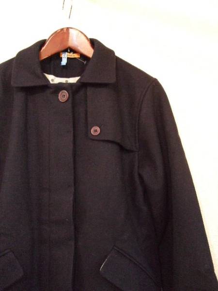 | 商品紹介 | ネイビーのシンプルなコートです。 腿中央位の丈で他のアイテムと合わせたときにバランス良く着られます。 着た時には見えませんが、裏地がブルーグレーにグレーのドットでかわいいです。 素材:毛80% レーヨン20% 表示記載がありませんが、裏地が付いています。 |