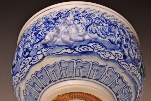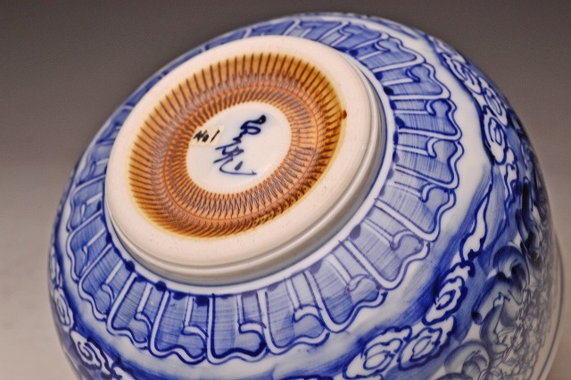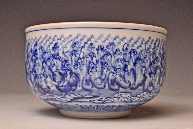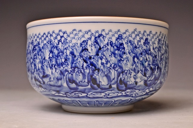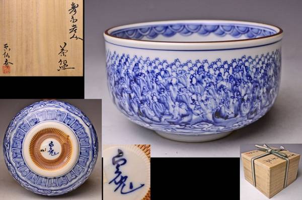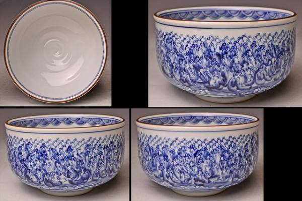 サイズは 120mmx高さ70mm です。 巨匠 河本礫亭 氏に 師事された 名工 木村勝明 氏の 作品 です。 手慣れた 筆使いで 寿老人が たくさん 描かれています。 染付の鮮やかな ブルーが 印象的な 茶碗 です。高台内の飛び鉋も見事な出来具合です。 写真を参考の上 入札下さい。 宅配便80サイズにて 発送します。他にも多数出品してます。同梱対応いたします。