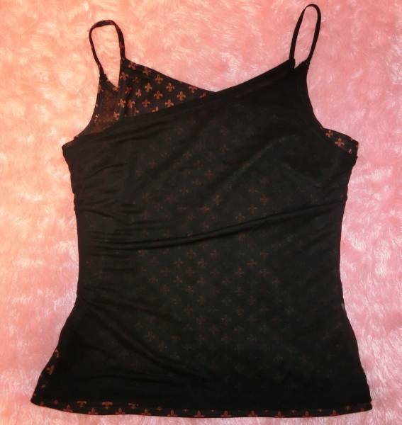 ブラックがベースのオレンジのカッコいい柄で、トップは透け感がある2枚重ねに着て頂くことが出来て、ホントお洒落です^^