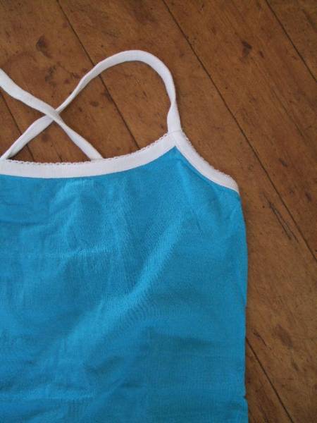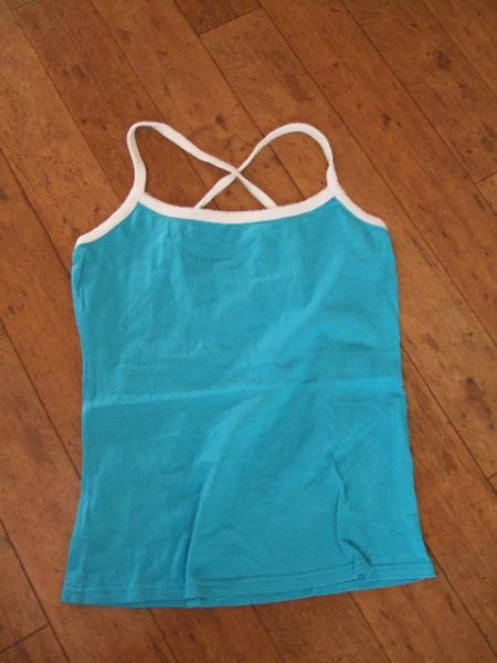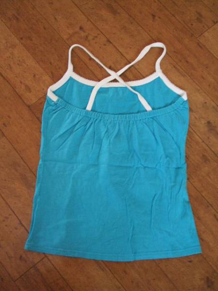 商品紹介 | 鮮やかなブルーに襟元と肩紐が白のラインになった キャミソールです。 肩紐は後ろでクロスするデザインです。 素材:綿100% |