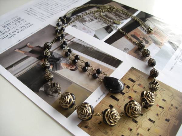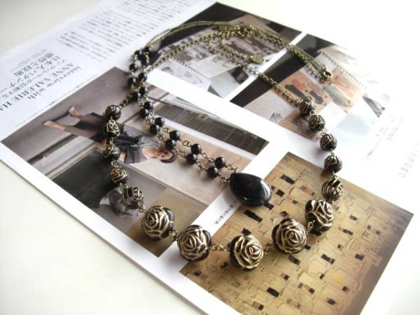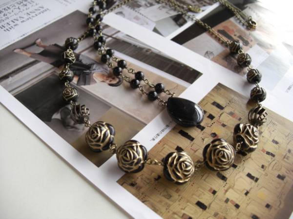やさしさを紡いで・・シリーズです♪黒い薔薇の物語・・シックな黒い薔薇とオニキスのネックレス2本セットです♪ゴールドラインの黒の樹脂薔薇は10ミリと14ミリ位の大きさ違いです♪透かしチャームを合わせてさりげなくロマンチックな表情です♪♪長さは全長65センチ位で調節自由です♪チョーカー風にされても可愛いです♪25×18ミリ位のフラットドロップのオニキスは6ミリの丸玉のオニキスを合わせました♪長さは66センチ+アジャスター12センチで最長78センチ位です♪単品やお揃いのブレスレットも出品しています♪シンプルでいつまでも着けられるデザインを考えて作りました!ハンドメイドをご理解頂いてノークレーム、ノーリターンでお願いします