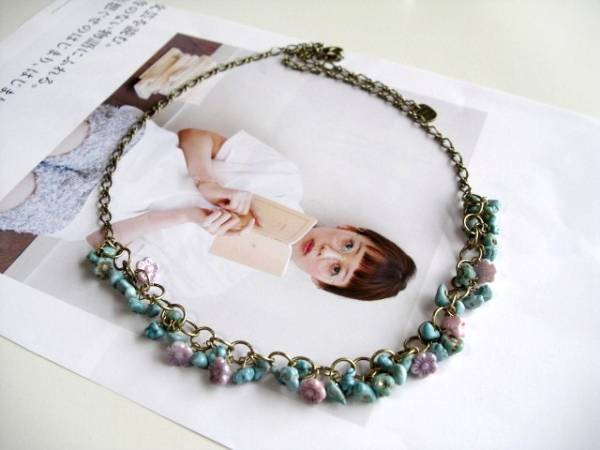 クレアの衣装箱・・シリーズです♪ターコイズとお花と・・繊細でやさしい雰囲気のターコイズのネックレスです♪さざれのターコイズをチェコのお花でおめかししてロマンチックな表情です♪6ミリから7ミリ位のさざれのターコイズにはダークパープルやパープルピンクやターコイズ色の8ミリ位のチェコのお花を散らしました♪長さは全長65センチ位で調節自由です♪チョーカー風にされても可愛いです♪お揃いのネックレスやブレスレット、イヤリングも出品しています♪シンプルで長く着けていただけるデザインを考えて作りました!ハンドメイドをご理解頂いてノークレーム、ノーリターンでお願いします