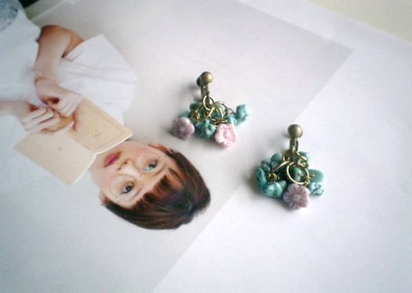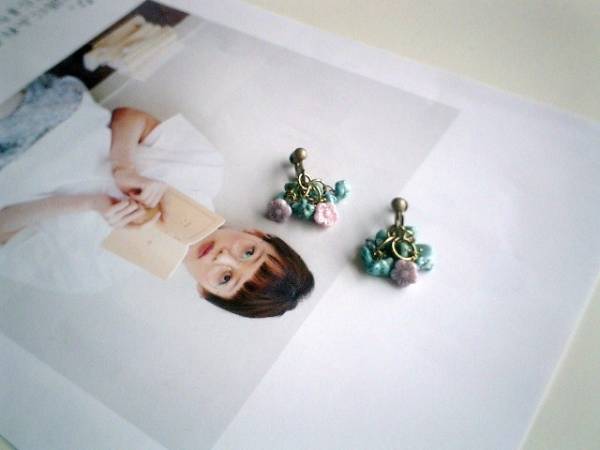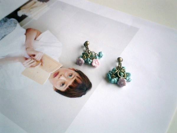 クレアの衣装箱・・シリーズです♪ターコイズとお花と・・繊細でやさしい雰囲気のターコイズのイヤリングです♪さざれのターコイズをチェコのお花でおめかししてロマンチックな表情です♪6ミリから7ミリ位のさざれのターコイズにはダークパープルやパープルピンクやターコイズ色の8ミリ位のチェコのお花を散らしました♪長さは全長3センチ位です♪ピアスにも変更出来ます♪お揃いのネックレスやブレスレットも出品しています♪シンプルで長く着けていただけるデザインを考えて作りました!ハンドメイドをご理解頂いてノークレーム、ノーリターンでお願いします