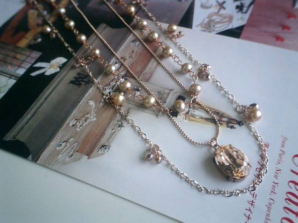 クレアの衣装箱・・シリーズです♪パール・レッスンⅤ・・さりげなく華やかなベージュピンクの淡水パールとスワロやチェコビーズのネックレス3点セットです♪色々な組み合わせで楽しんでいただけます♪♪ピンクゴールドのチェーンを合わせて甘すぎない大人のロマンチックしています♪7ミリ位のポテトの淡水パールはシンプルに繋いで合わせやすいデザインです♪長さは78センチ位で調節自由です♪6ミリ位のポテトの淡水パールには3ミリ、4ミリのチェコビーズを合わせました♪長さは75センチ+アジャスター10センチで最長85センチ位です♪18ミリ×13ミリのスワロは極小のピンクゴールドのボールチェーンを合わせました♪長さは68センチ+アジャスター12センチで最長80センチ位です♪それぞれ単品やブレスレットやイヤリングも出品しています♪シンプルで長く着けていただけるデザインを考えて作りました!ハンドメイドをご理解頂いてノークレーム、ノーリターンでお願いします