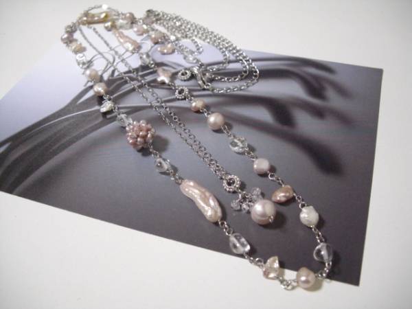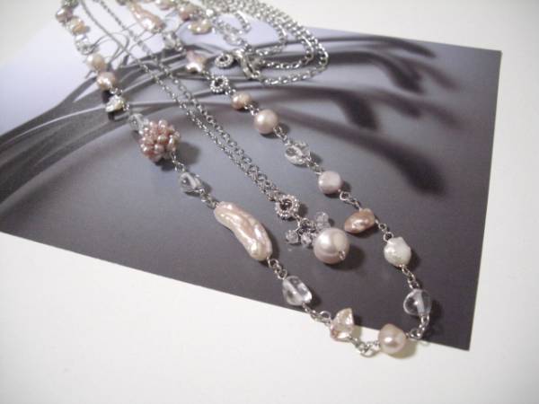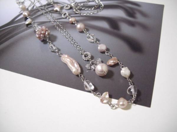 シモーヌの宝石箱・・シリーズです♪白雪姫の首飾り・・繊細な淡水パールや芥子パール、水晶を集めてロマンチックなネックレス2点セットです♪色々な組み合わせで楽しんでいただけます♪16ミリ位の淡水パール玉のネックレスは8ミリから23ミリ位までのポテトやラフカット、クロスやステック、バロックや芥子などの淡水パールや水晶を合わせました♪長さは全長102センチ位で調節自由です♪2連にされても素敵です♪華奢なチェーンのトップには15×10ミリ位の淡水パールのドロップや4ミリのランダムカットの水晶やデザインリングを合わせました♪長さは74センチ+アジャスター14センチで最長88センチ位です♪トップは4センチ位です♪お揃いのネックレスやブレスレットやピアスも出品しています♪シンプルで長く着けていただけるデザインを考えて作りました!ハンドメイドをご理解頂いてノークレーム、ノーリターンでお願いします