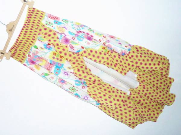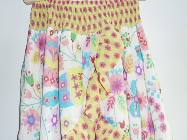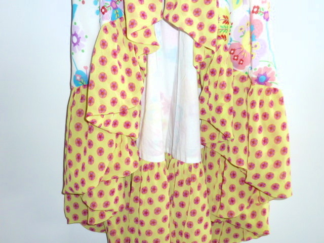 スカートの周りには、イエローベースの模様の生地が、フリルとしてふんだんに使われています。スペインの民族衣装を思われる、華やかなデザインです。
