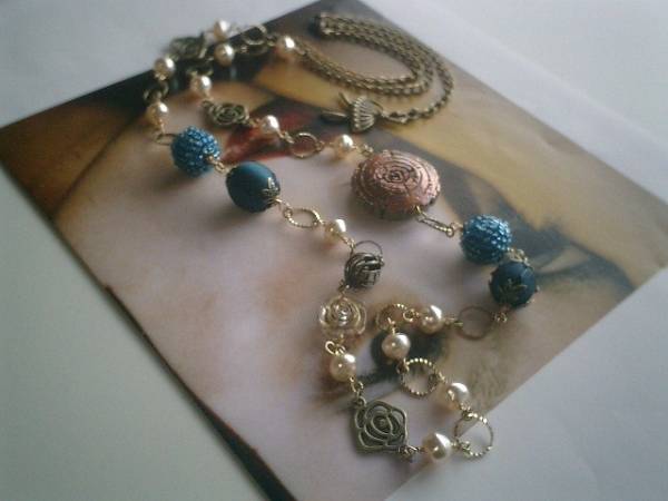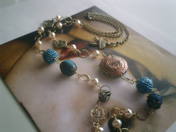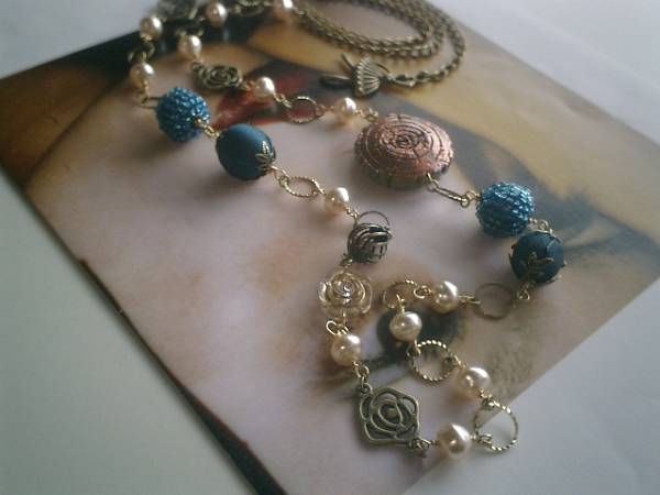 パリの衣裳部屋・・シリーズです♪薔薇の帽子箱・・シックな異素材のネックレスです♪10ミリから30ミリ位までの樹脂パールやアンティークビーズやビーズボールやサテンビーズや透かしチャームや薔薇のチャームを合わせてさりげなく華やかな表情です♪長さは全長103センチ位で調節自由です♪2連にされても素敵です♪お揃いのブレスレットも出品しています♪シンプルで飽きのこないいつまでも着けられるデザインを考えて作りました!ハンドメイドをご理解頂いてノークレーム、ノーリターンでお願いします