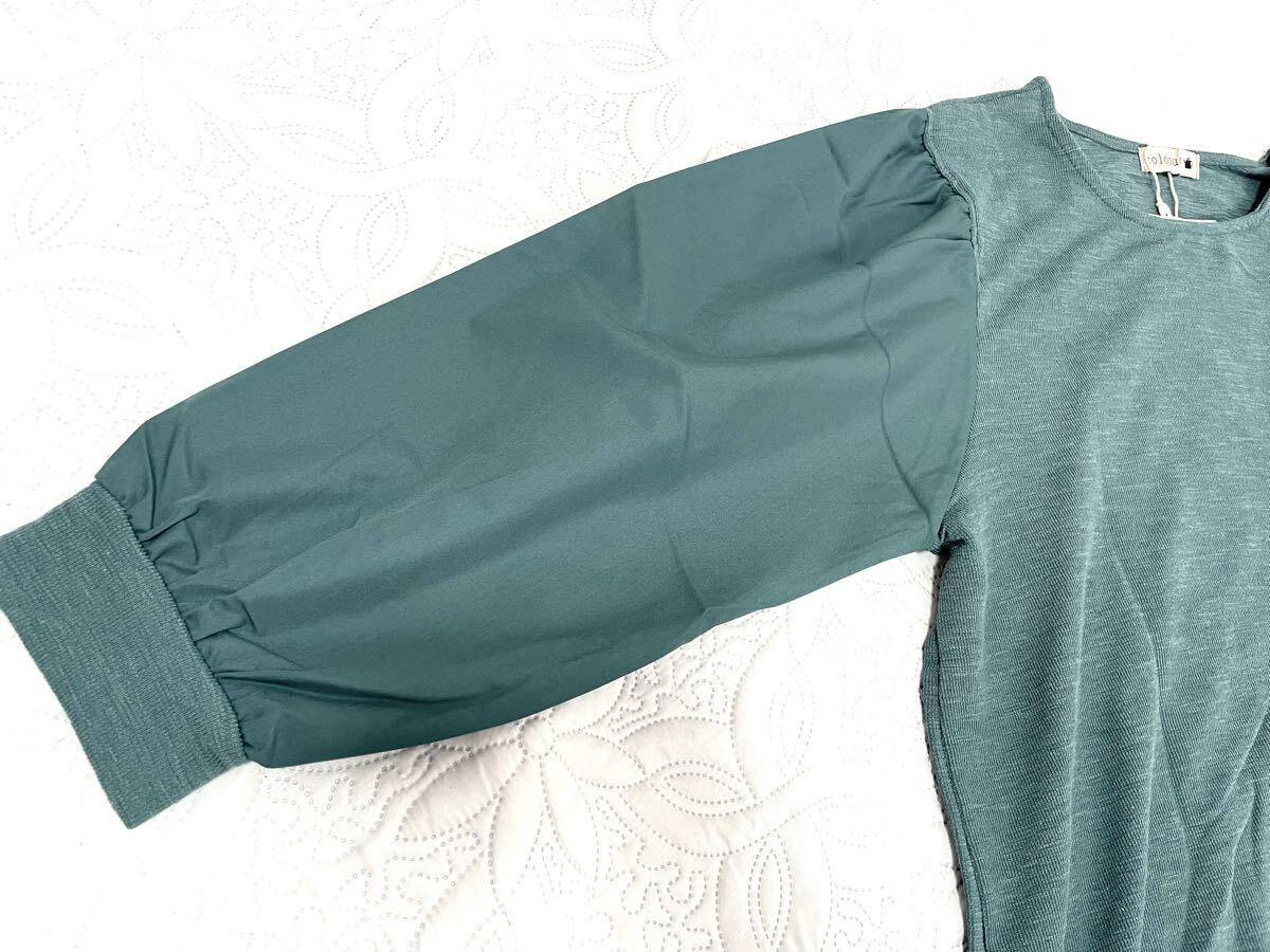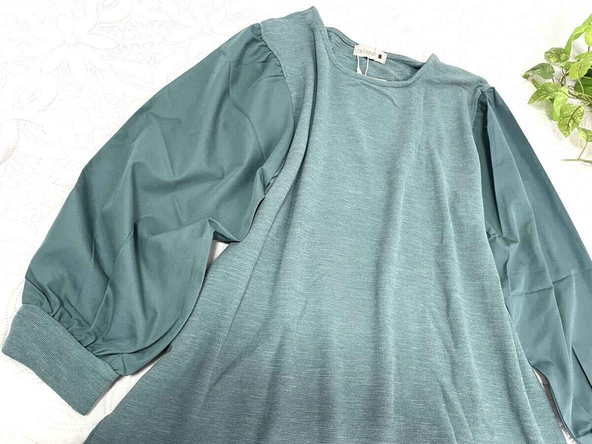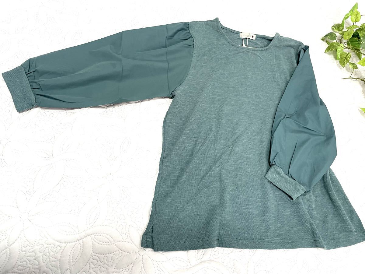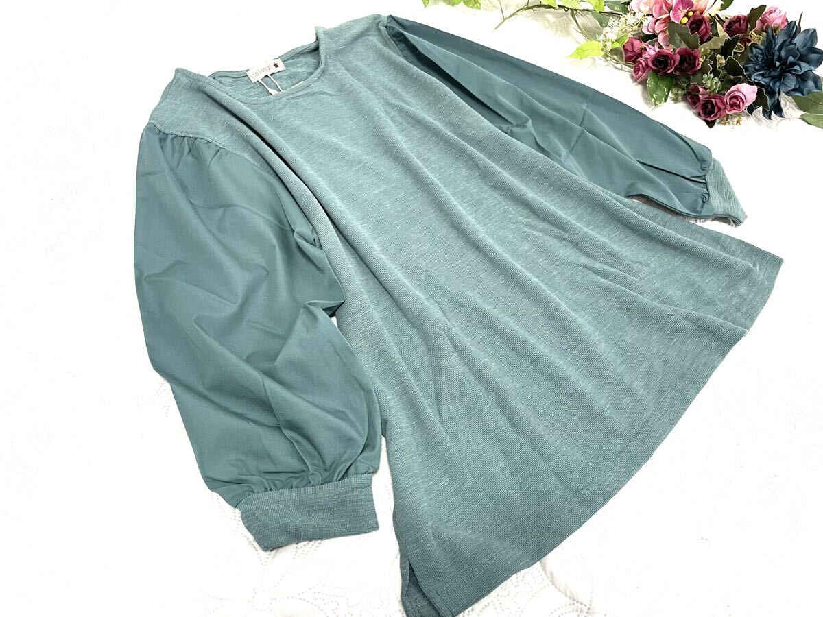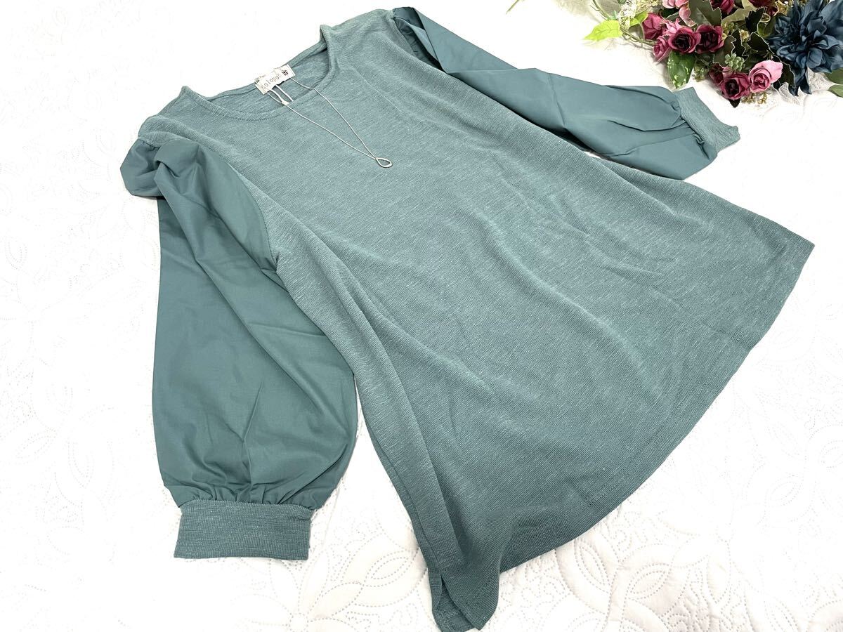 f■4L■新品■ナチュラルカジュアル*ボリューム袖*布帛素材*裾ラウンド■グリーン③