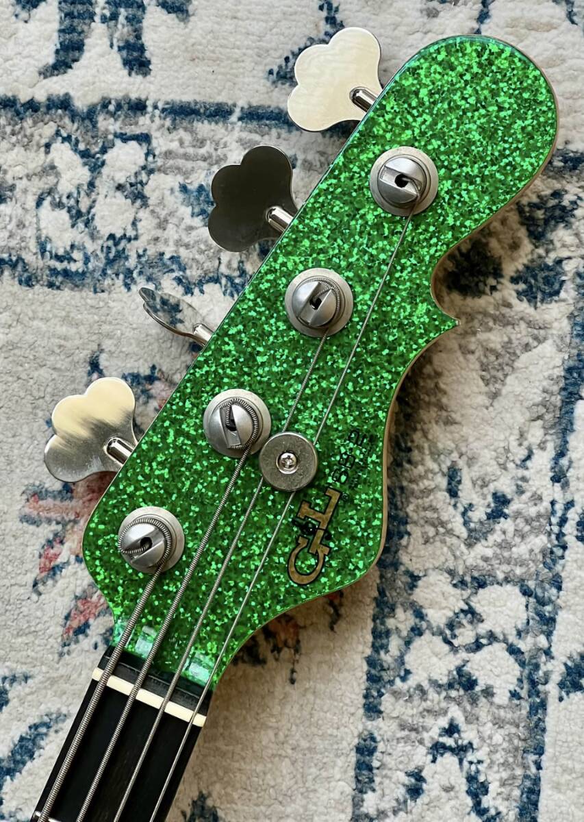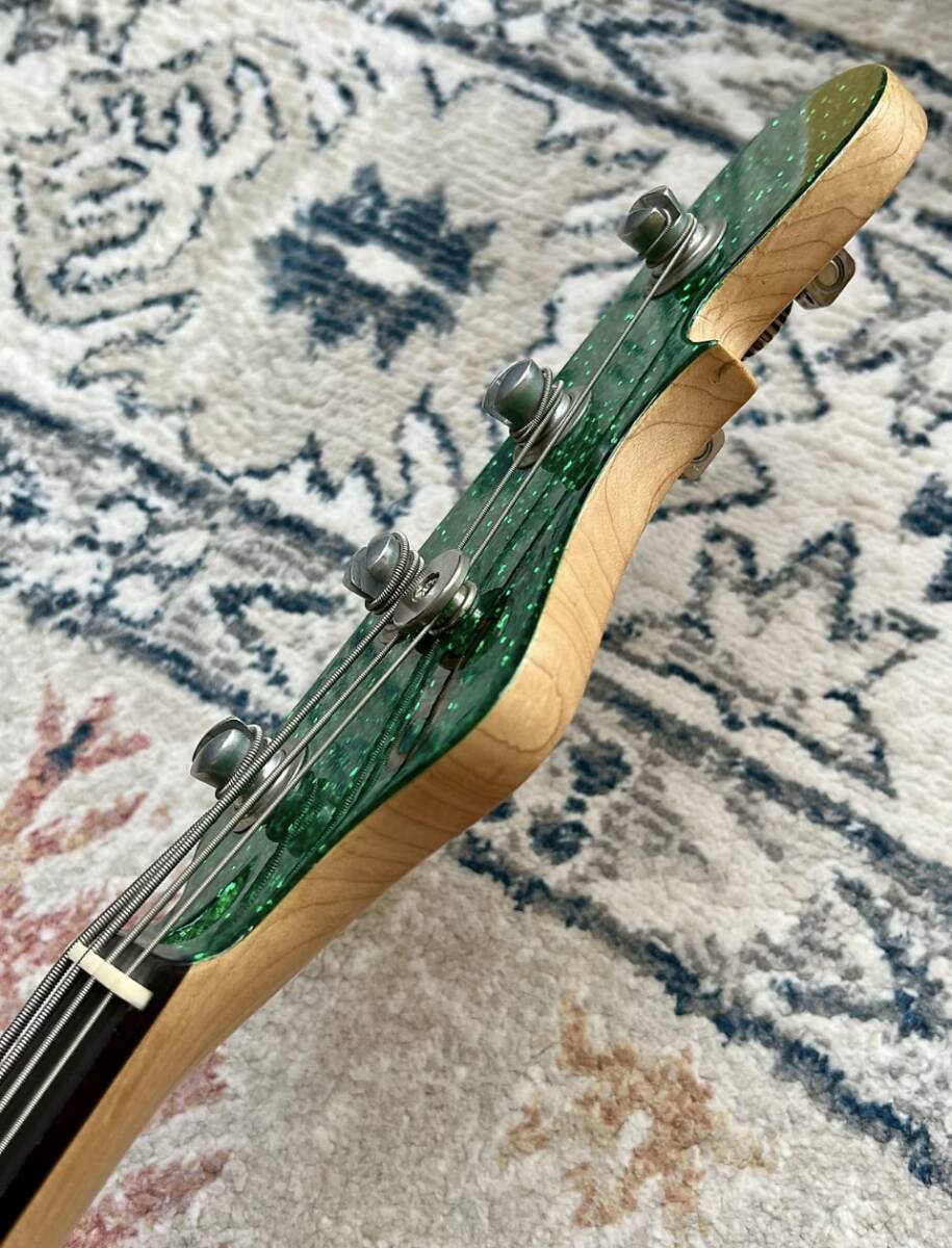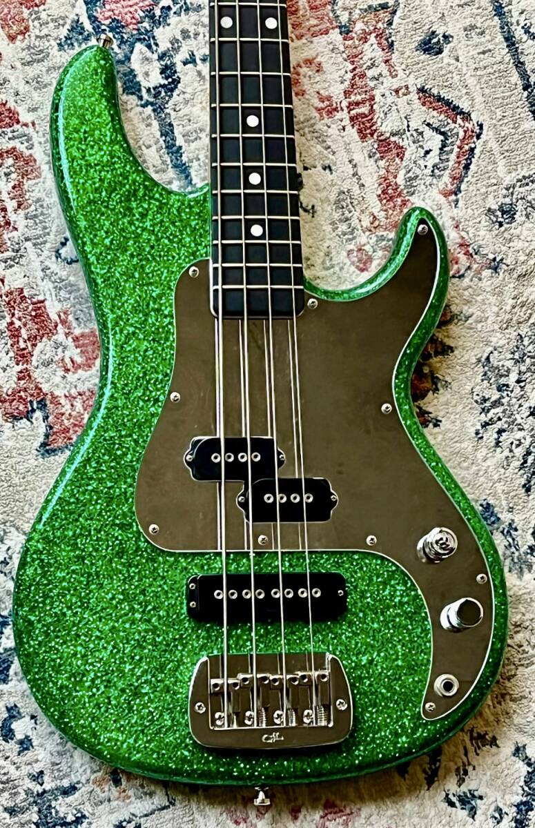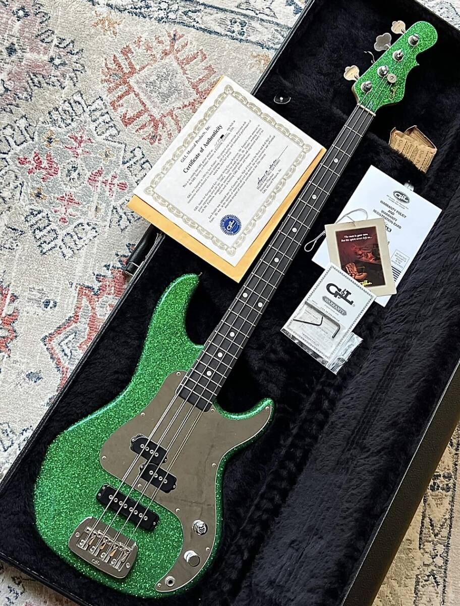 2010 G&L USA SB-2 Bass の出品になります。色は希少な グリーン メタル フレークのマッチング ヘッド、ミラーガードです。パシブのP & J pu でコントロールはvol & volです、Hipshot tuning pegs 、ノブが1つスカルノブに交換されております(オリジナル ノブは有りません)。多少傷ありますが、弾きやすく、とても良いコンデションを保ってると思います。オリジナルG&Lハードケース付きです。中古楽器なのでNC/NRでお願いします。