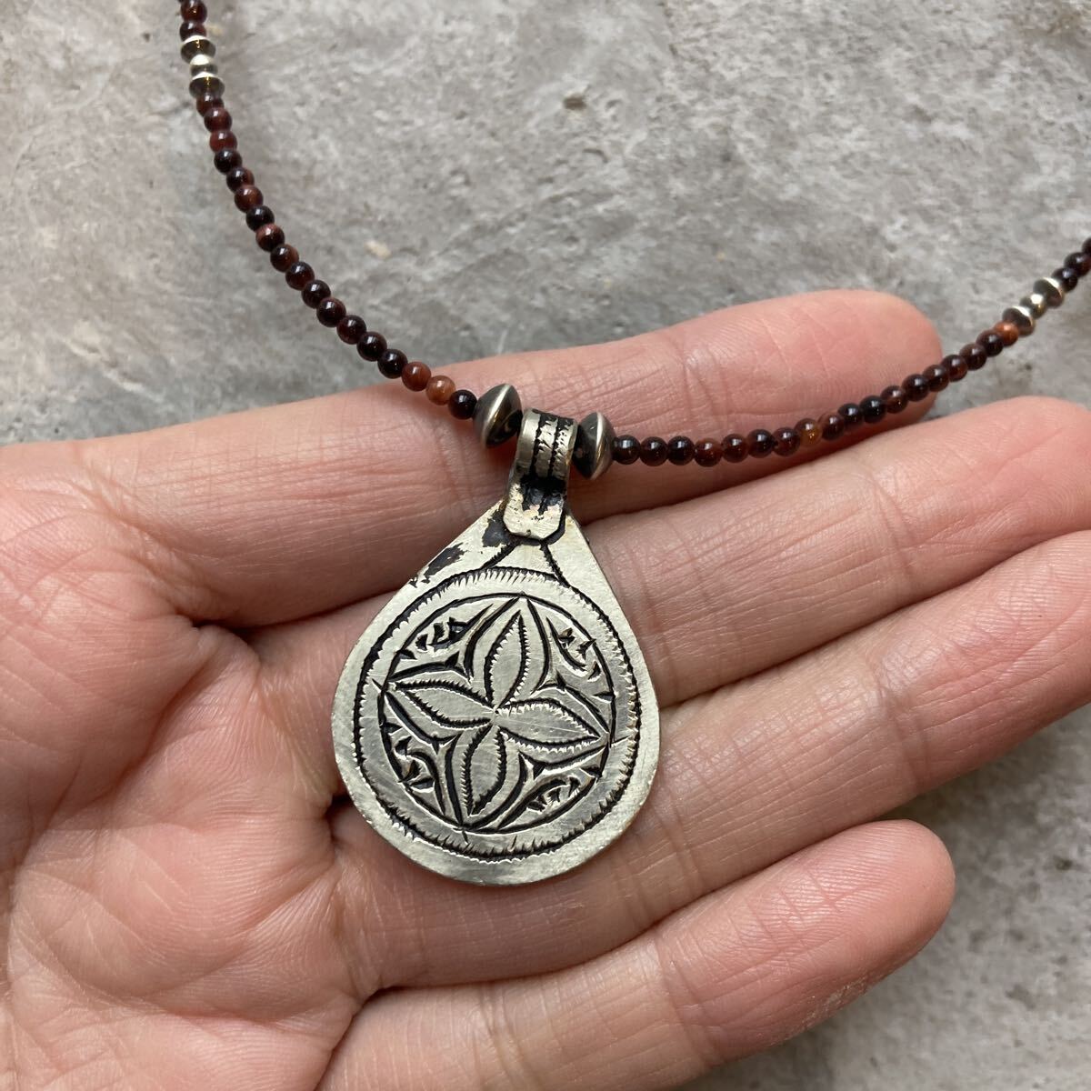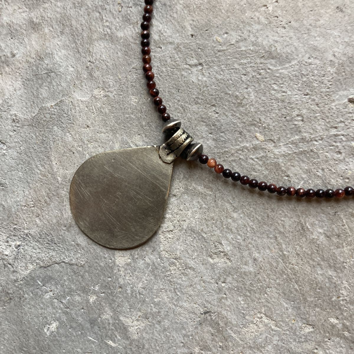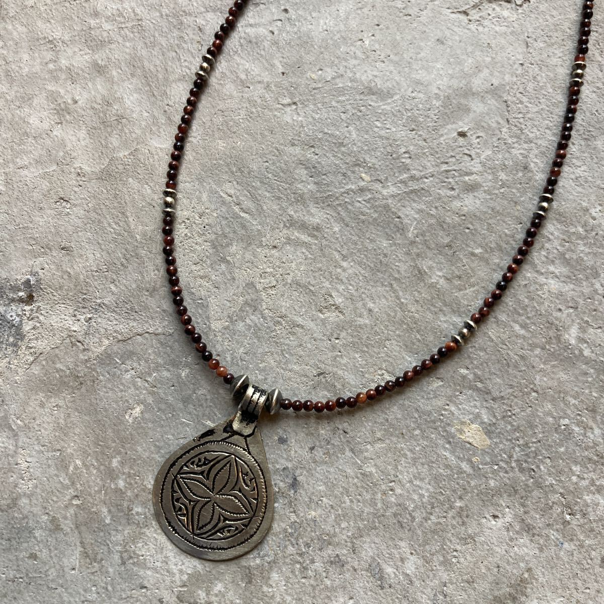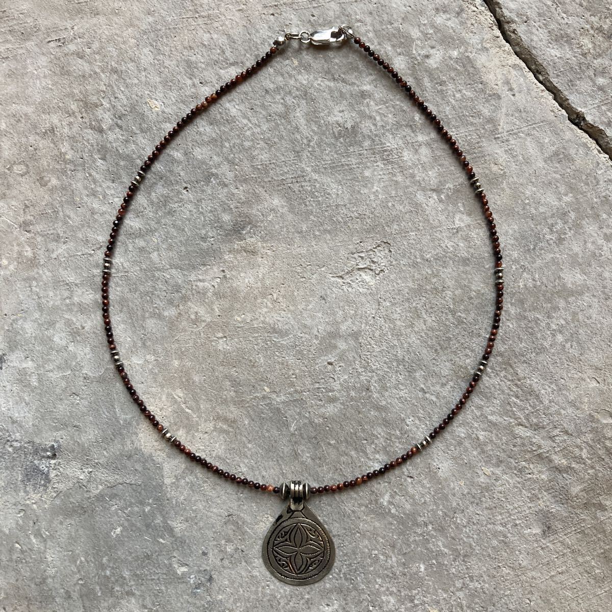 北アフリカの遊牧民、自由の人といわれるベルベルの家に何代も伝わる柄が細かく彫り込まれたとても雰囲気のあるペンダントトップに、小粒のレッドタイガーアイ、SV925製ナバホパールビーズを合わせたオリジナルネックレスです。
