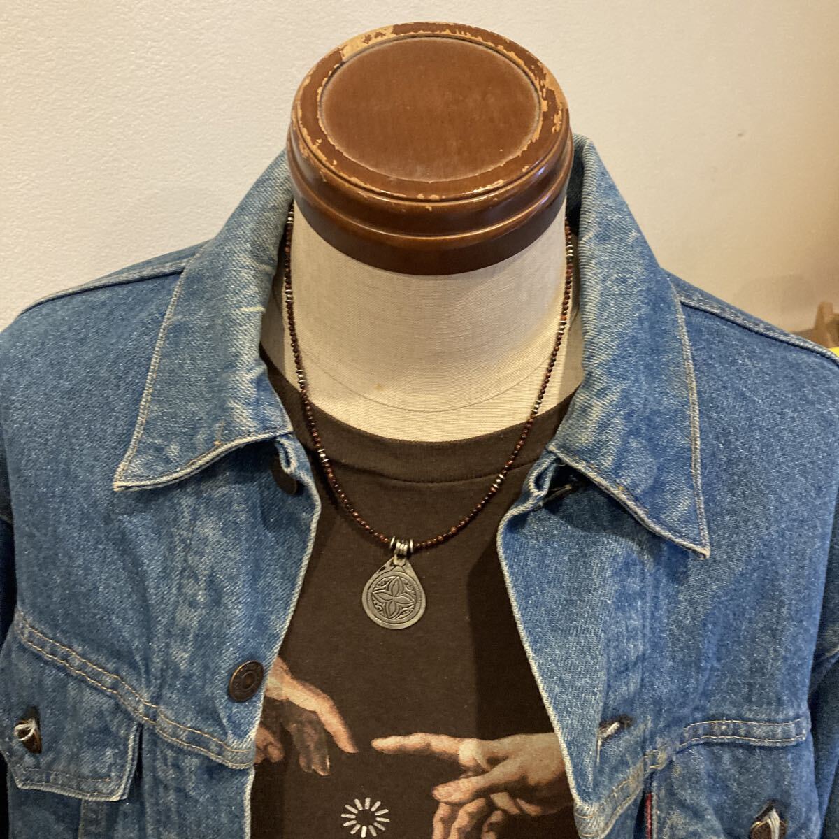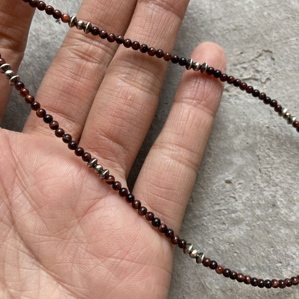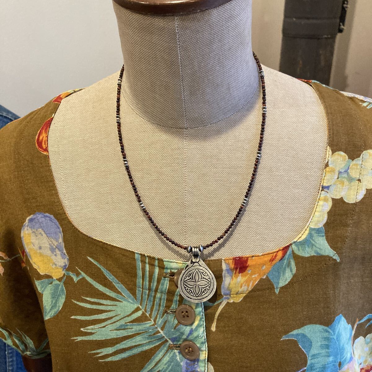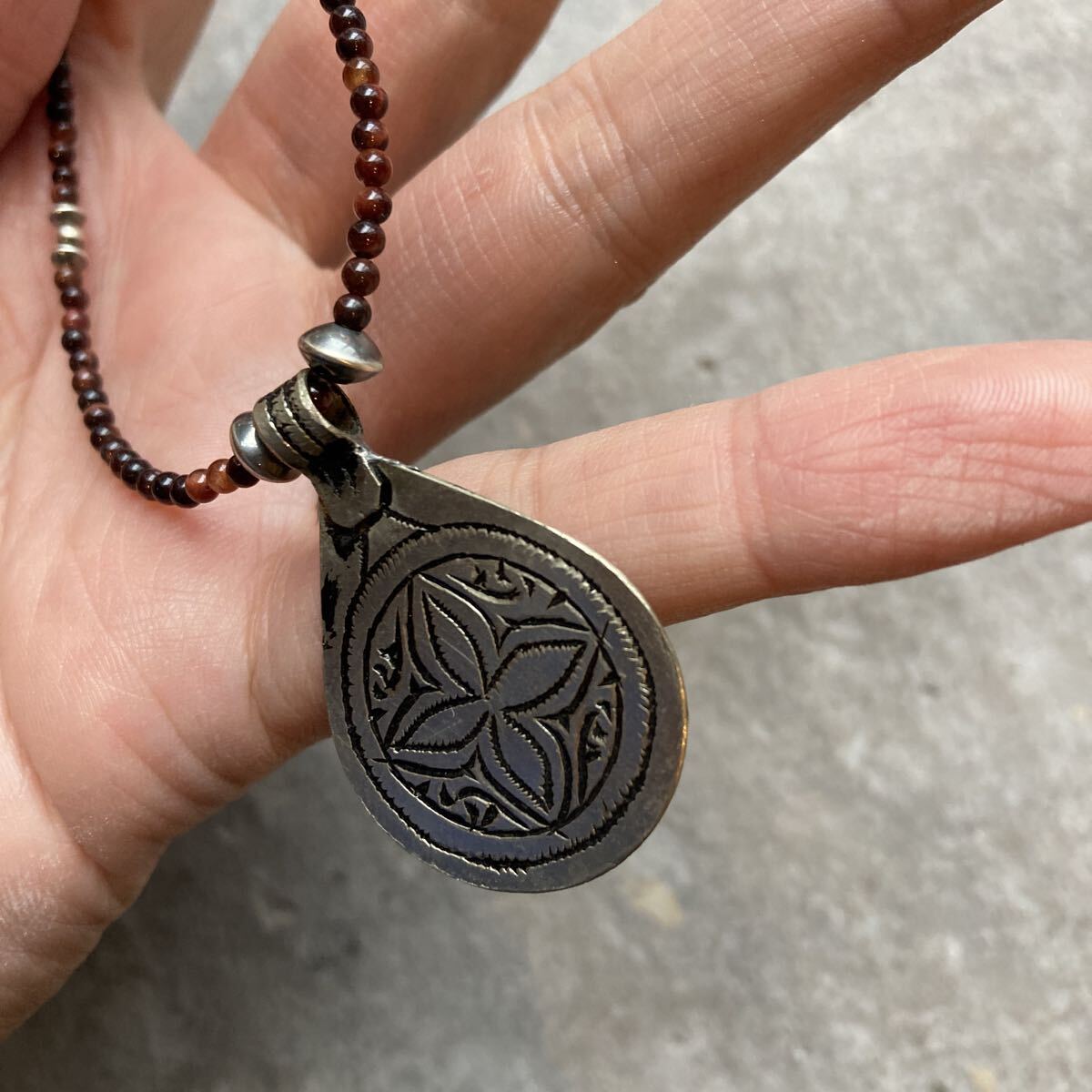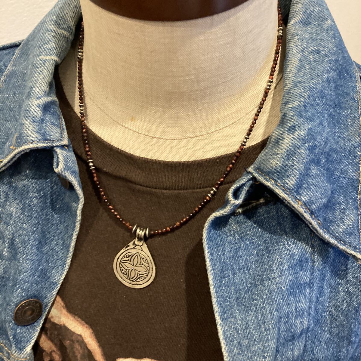 北アフリカの遊牧民、自由の人といわれるベルベルの家に何代も伝わる柄が細かく彫り込まれたとても雰囲気のあるペンダントトップに、小粒のレッドタイガーアイ、SV925製ナバホパールビーズを合わせたオリジナルネックレスです。