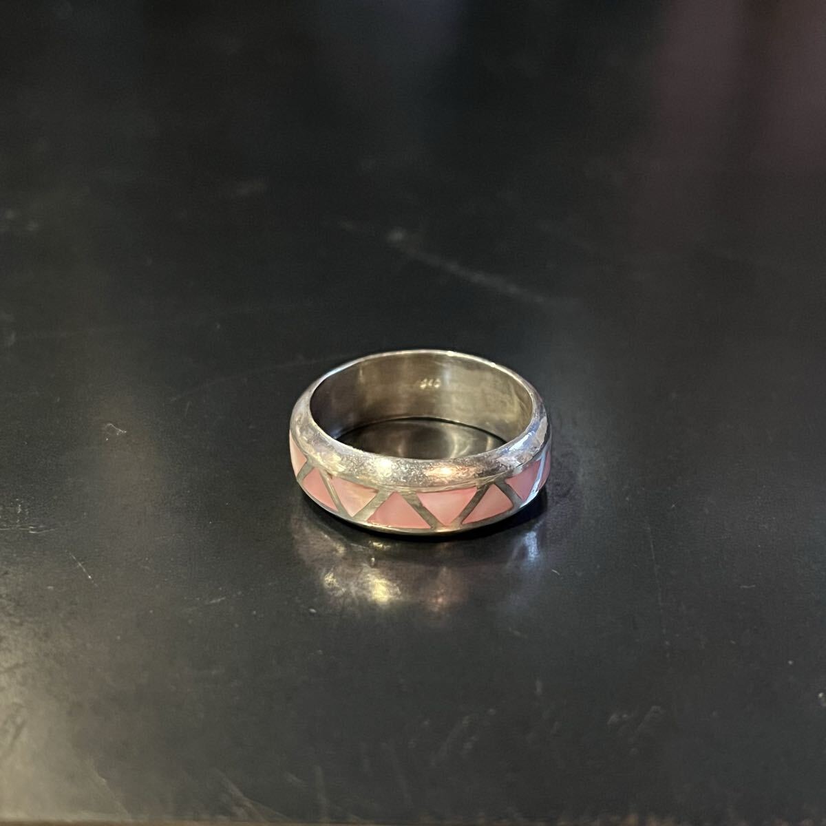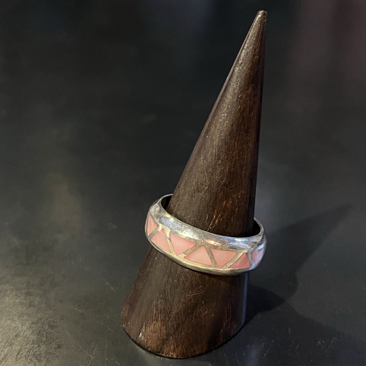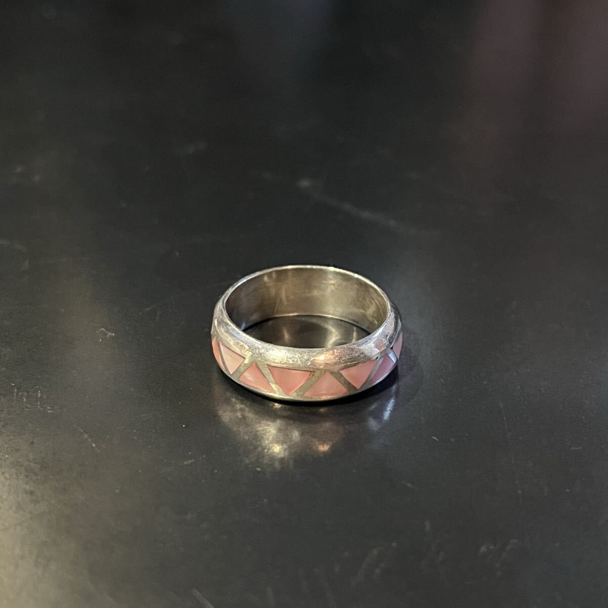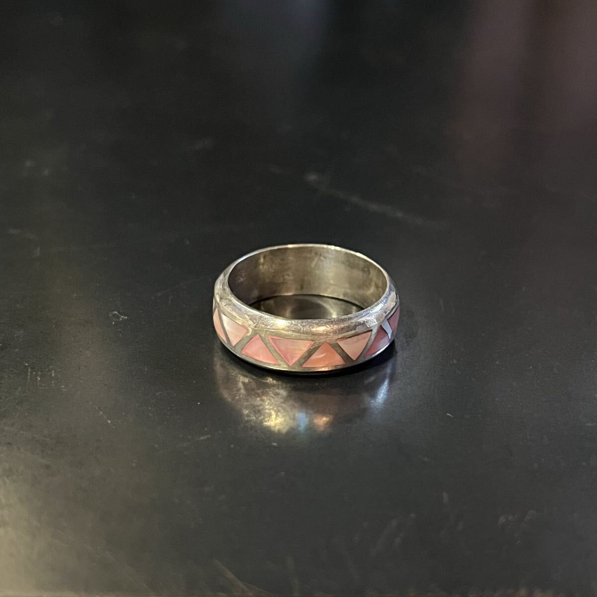 海外で買い付けたピンクストーンインレイデザインのシルバーリングです。