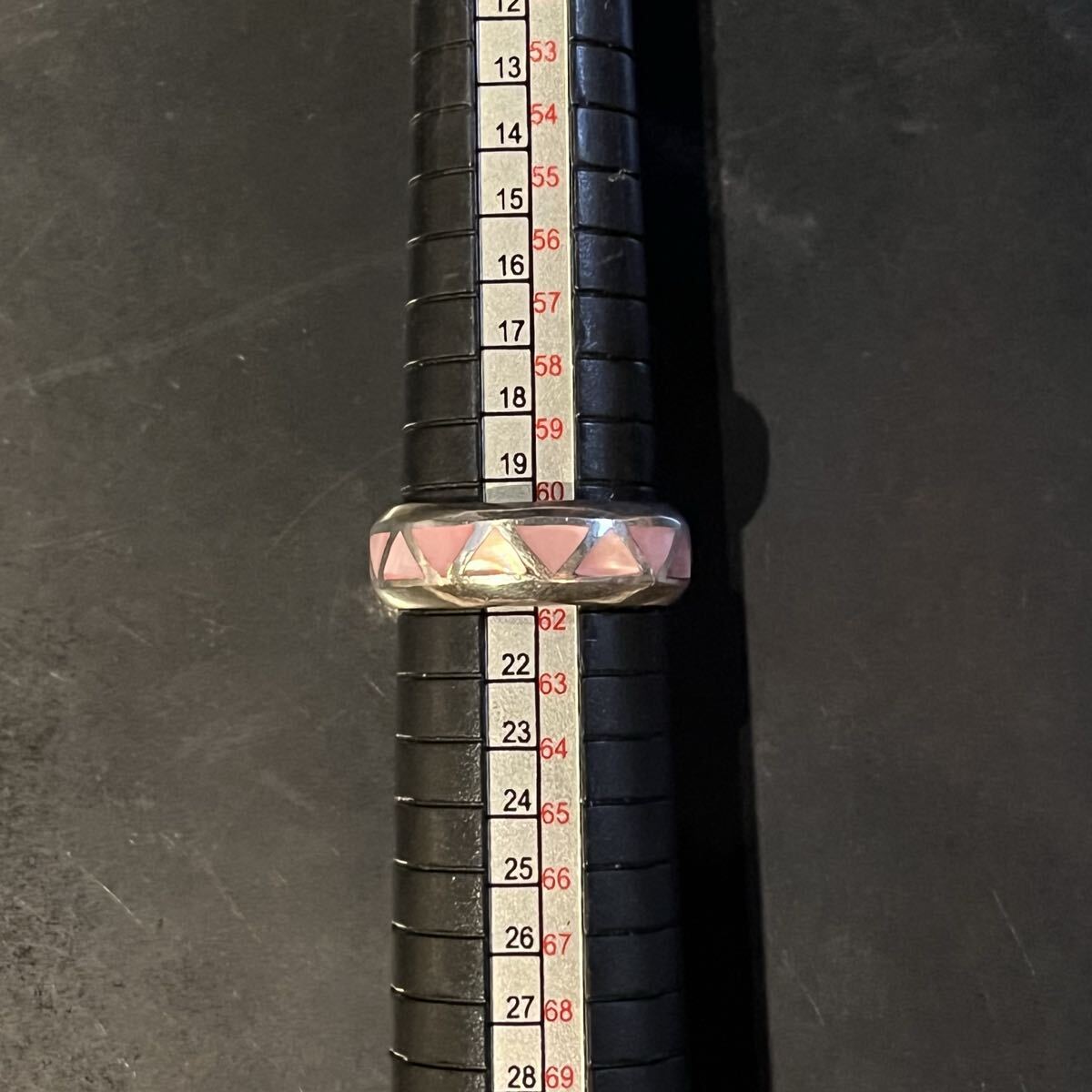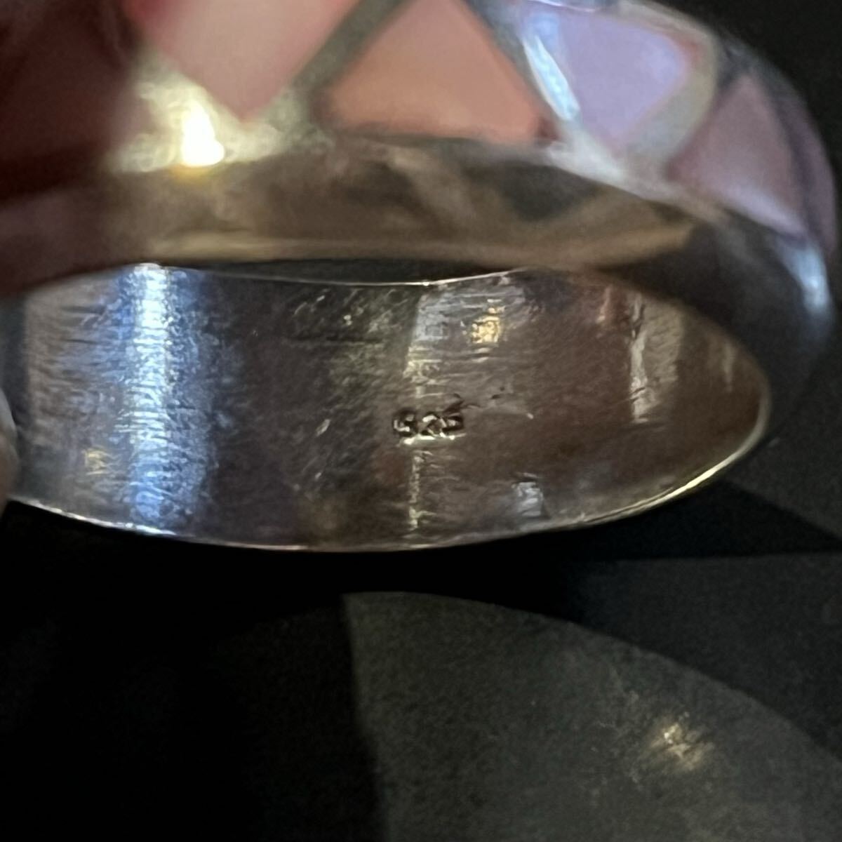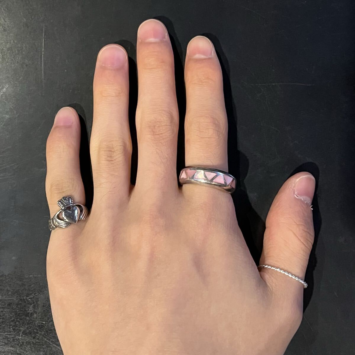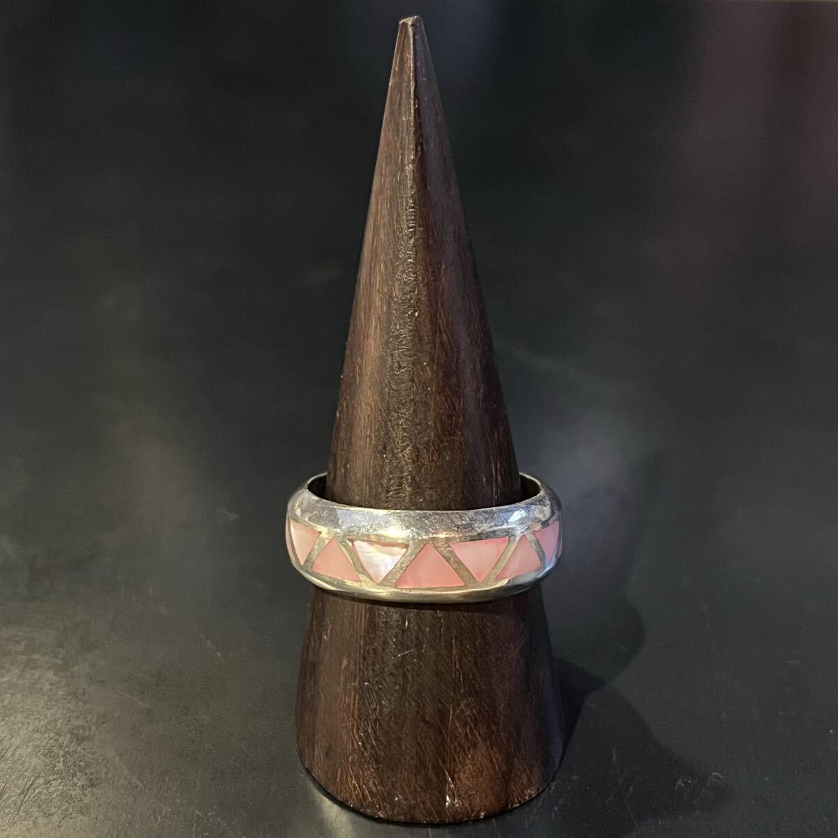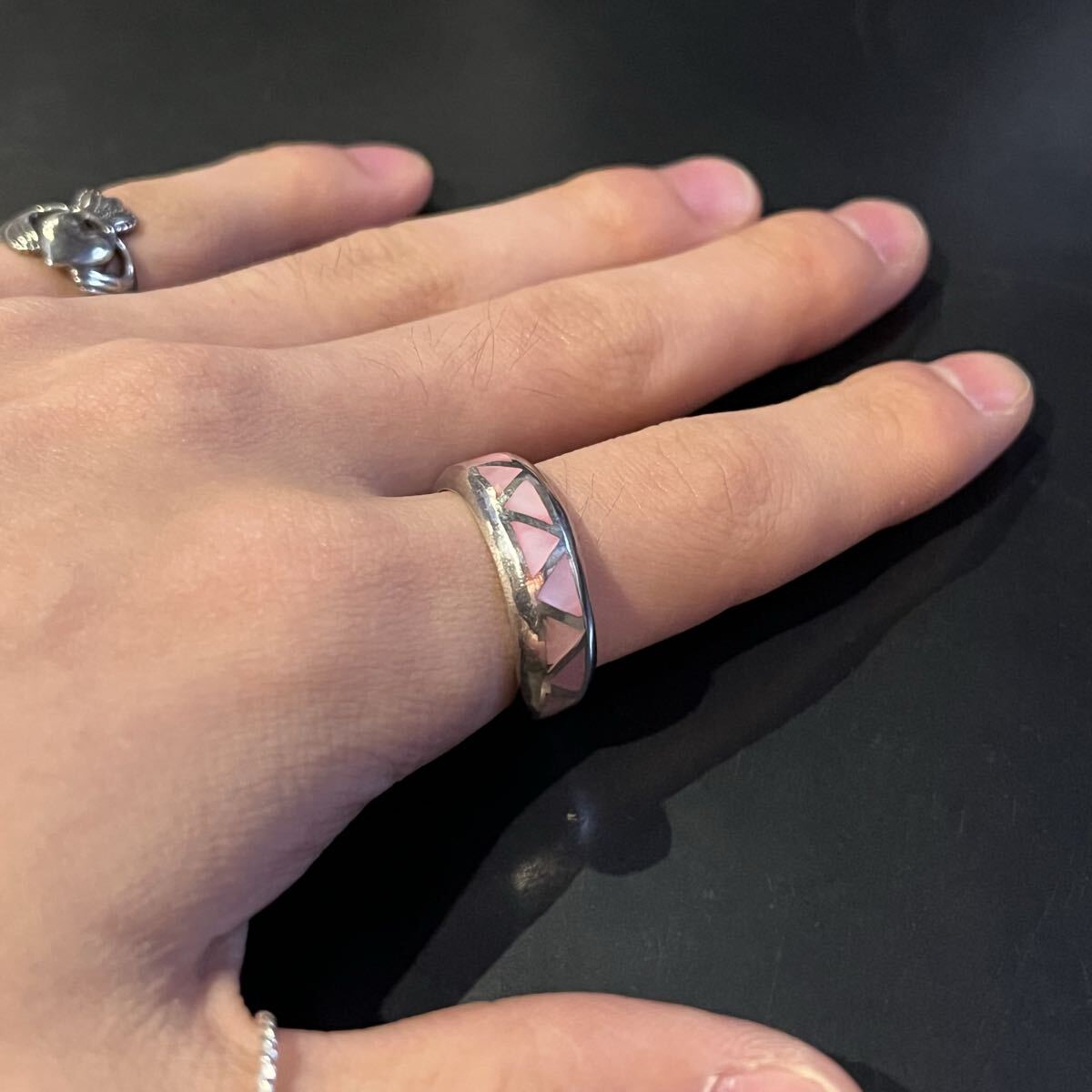 海外で買い付けたピンクストーンインレイデザインのシルバーリングです。