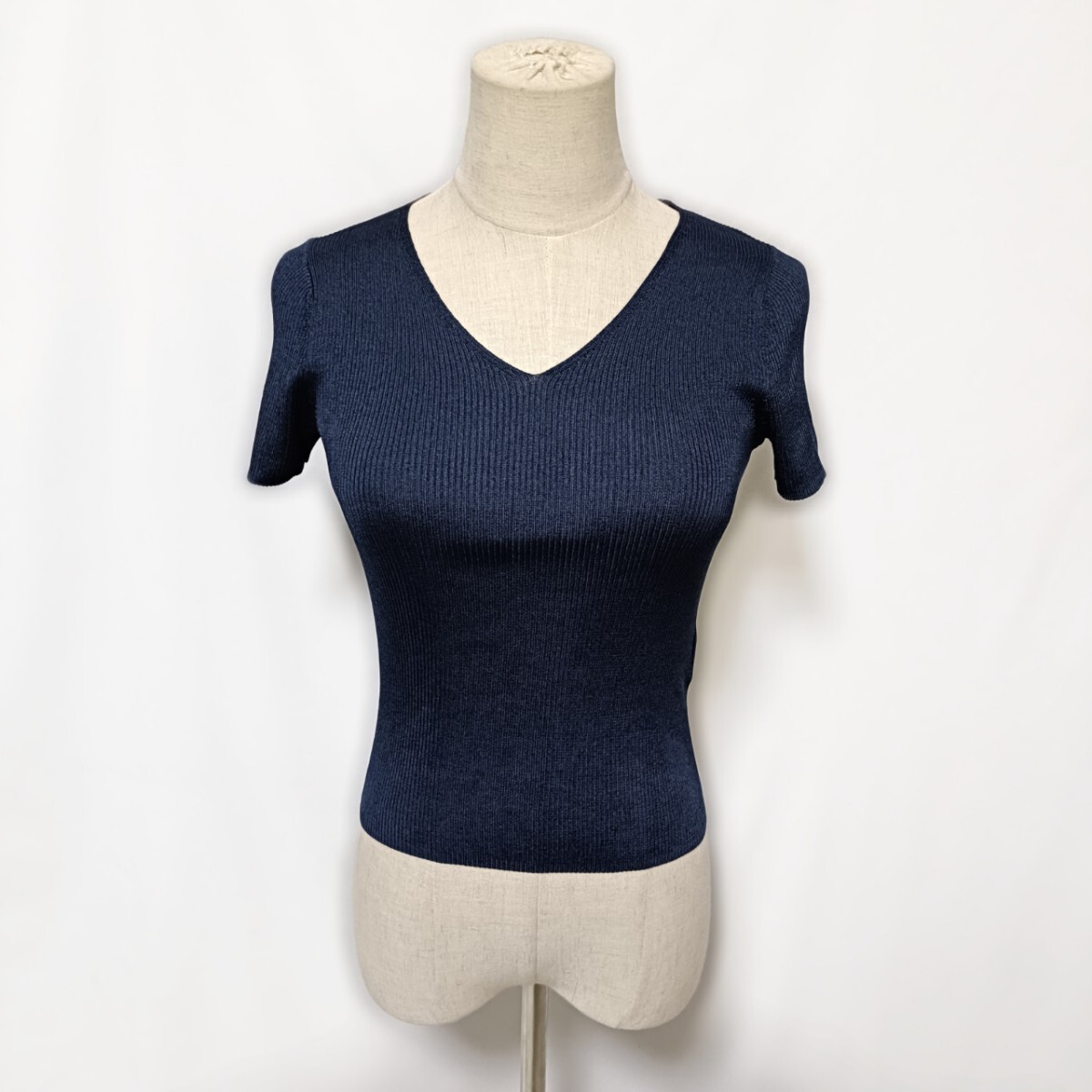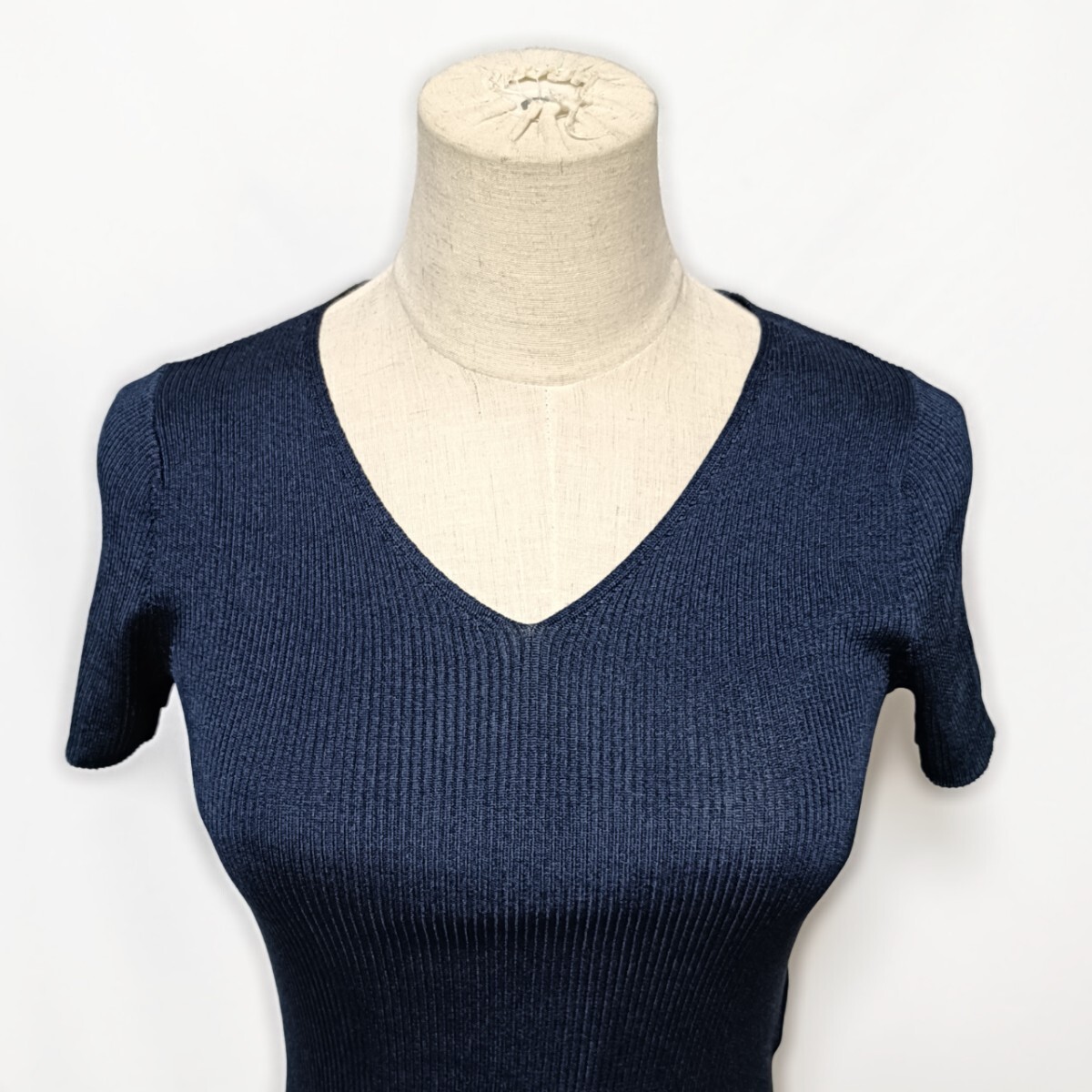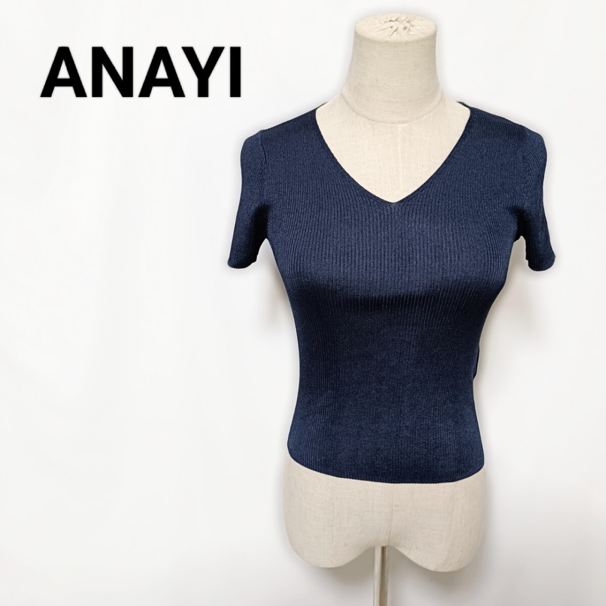 美品 ANAYI アナイ Vネック リブニット 半袖 トップス 濃紺 36 S カットソー フィット 春夏 アセテート