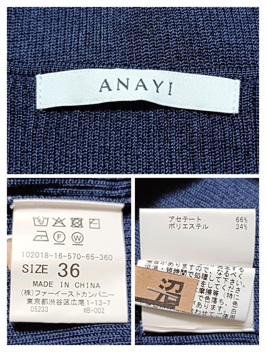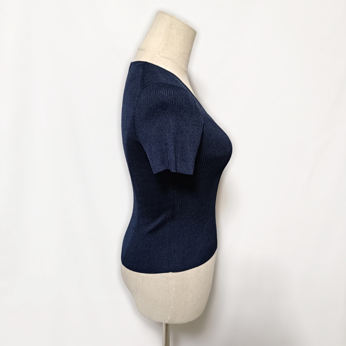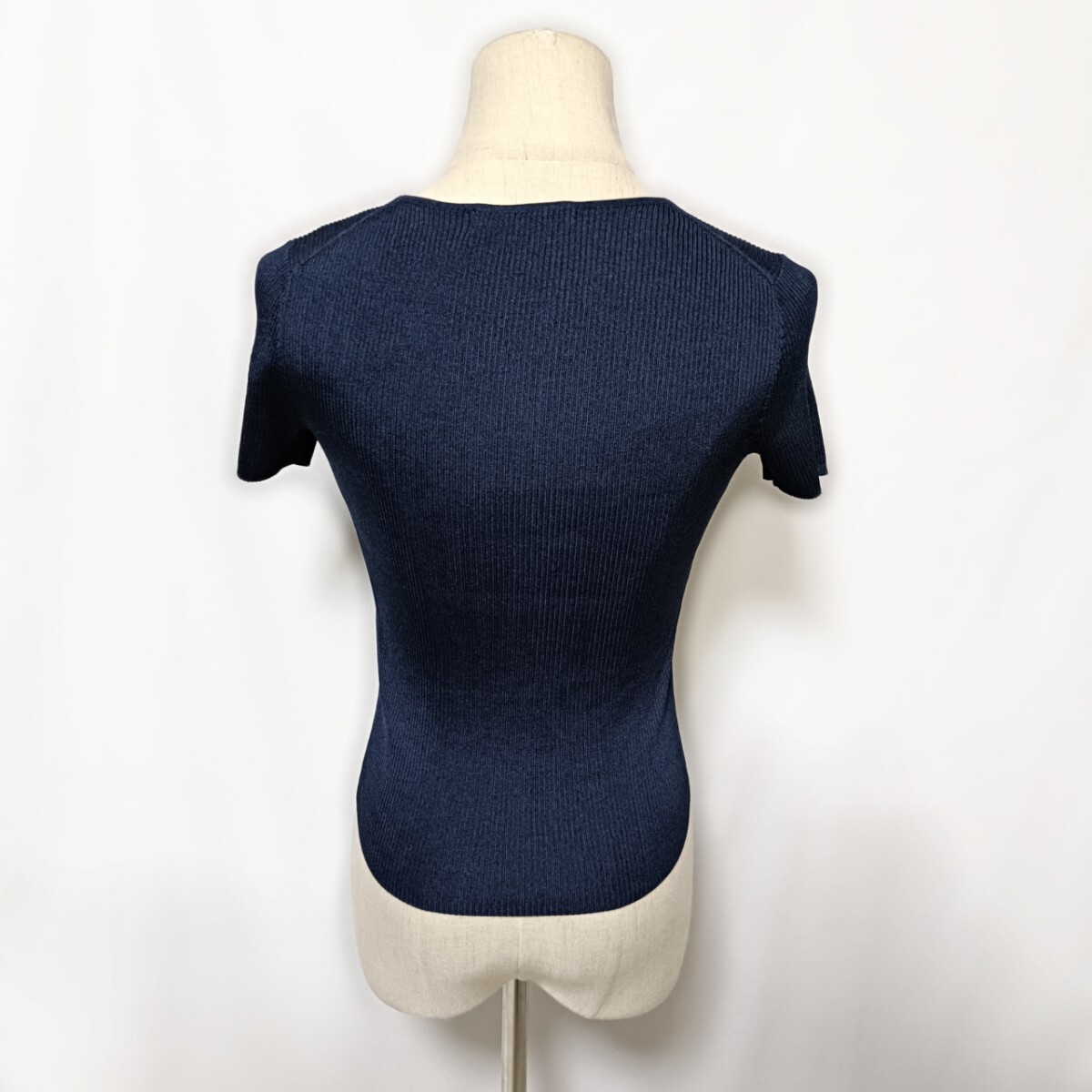 美品 ANAYI アナイ Vネック リブニット 半袖 トップス 濃紺 36 S カットソー フィット 春夏 アセテート