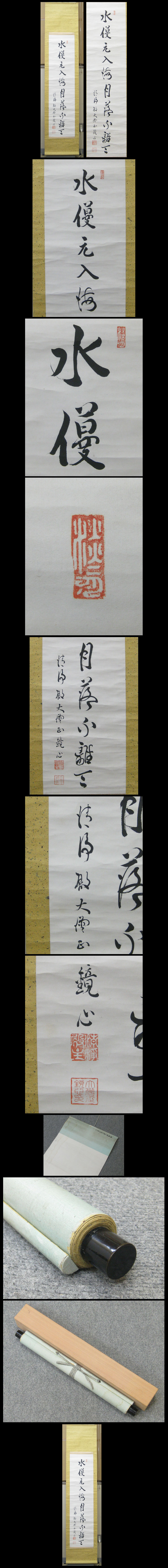 【加藤鏡心(浄誉)】1867~1941 清蓮社浄誉大阿光明。清浄華院七三世。 尾張国海東郡神島田村中一色(愛知県津島市)に熊沢慶三郎の三男として生まれる。 光明寺(名古屋市中村区)の伊藤鏡学のもとで宗学を修め、 明治二四年(1891)に伝光寺、同40年には光明寺の住職となった。 その後、大正元年(1912)には宗議会議員となり、 昭和六年(1931)に知恩院執事長、同九年に清浄華院七三世を歴任した。 護法の念が厚く、称名念仏に努めた。 ★商品サイズ★ ■掛軸 194×43cm ■作品 128×32.5cm ★商品の状態★ 作品・表具共に少しのしみ汚れ、折れ皺があります。 裏側上部に時代のしみ汚れがあります。 ご承知のうえご入札をお願いします。 時代など詳しくは画像にてよく確認のうえでご検討いただければと思います。 どうぞよろしくお願いいたします。 |