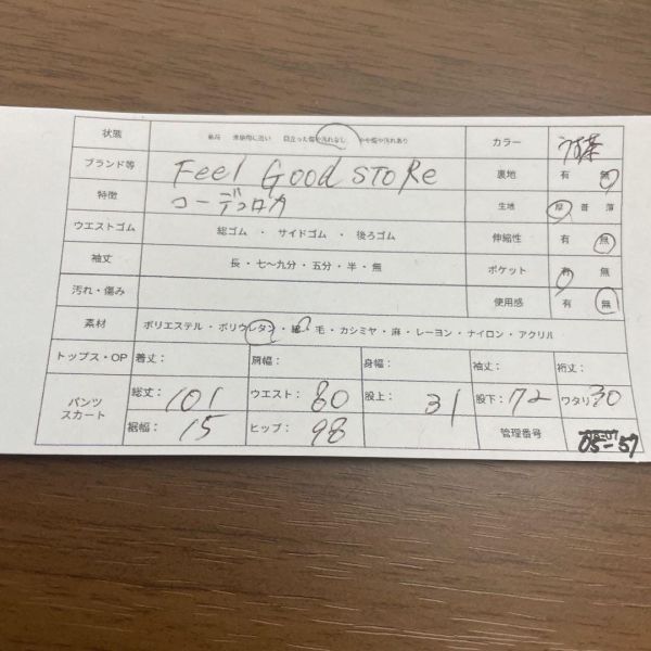 コーデュロイの温かみある素材感で秋冬に活躍する一本 - ブランド:Feel Good Store フィールグッドストア - サイズ表記:不明(L〜LL(11〜13号相当)) - 素材:コーデュロイ(綿 ポリウレタン) - カラー:ブラウン系 - シーズン:秋冬 - 服の特徴:コーデュロイ素材、ストレートシルエット、シンプルデザイン - 裾の長さ:フルレングス 管理番号: 05-57 即購入大歓迎・お得な割引各種あります 詳しくはプロフィールをご覧ください! 匿名&送料無料 海外輸入のため全て一点ものです 古着のため使用感・毛玉等があることもあります。写真で状態の確認を行なってからご購入ください おまとめ買いでお得な割引あります♪ 平置き採寸表→写真から確認いただけます! (素人採寸のため、多少の誤差はご了承ください) 商品状態に関しては、写真、商品説明欄に記載しております。着用回数、購入時期などはお答えできませんので、ご了承ください。着画、写真の追加もお断りしております。 簡易包装のコンパクト発送となります。 畳みシワはご了承の程、宜しくお願いいたします。 商品によっては圧縮してお送りするものもございます。 撮影環境や使用するモニター、反映されにくい色味など、 商品と画像に若干の色誤差が生じますことをご了承ください。 出品作業の際にしっかりと確認はしておりますが、シミなどの見落としがある場合もございますのでご了承下さい。 古着の取り扱いになりますので特有の匂い等がある可能性があります。ご理解のある方のみご購入の程お願い致します。