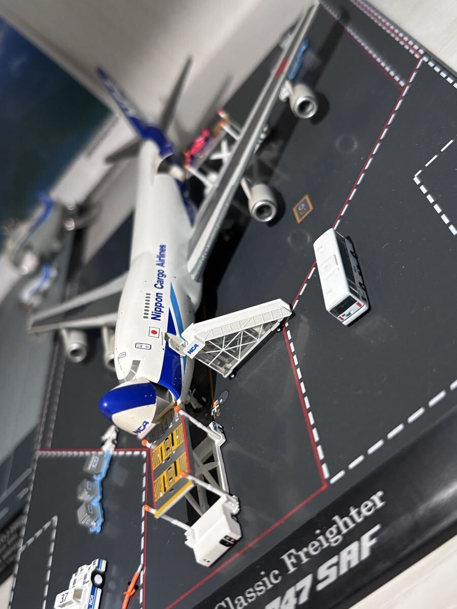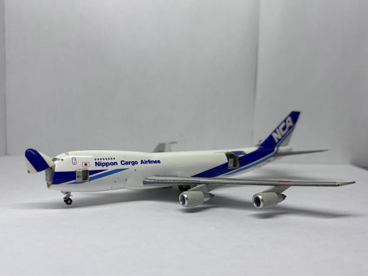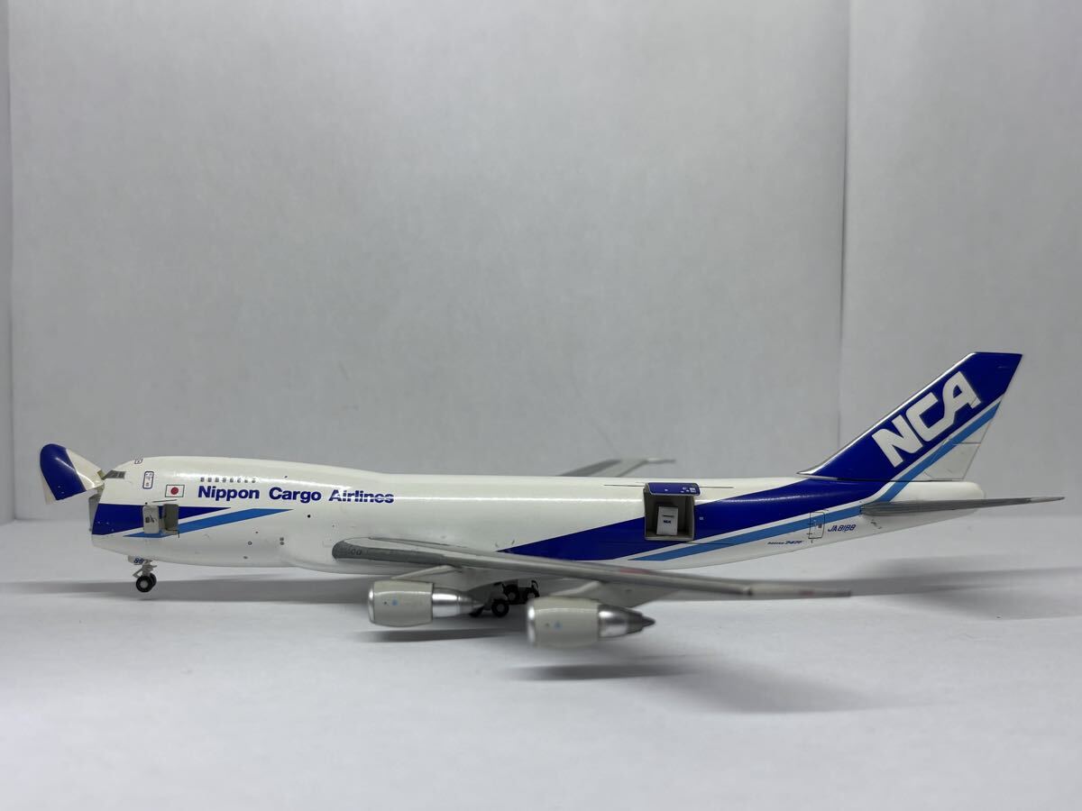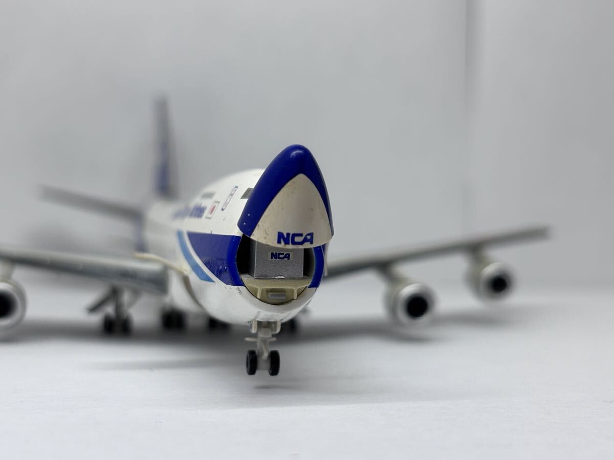 こちらは1/400 全日空商事 NCA ボーイング747-200F です。カーゴドアオープンのモデルで、本来ならGSEとジオラマプレートが付いているものですが、こちらは"本体のみ"となりますのでご注意ください。(GSEとプレートは当方保有の747SRFのもので、付属しません。)