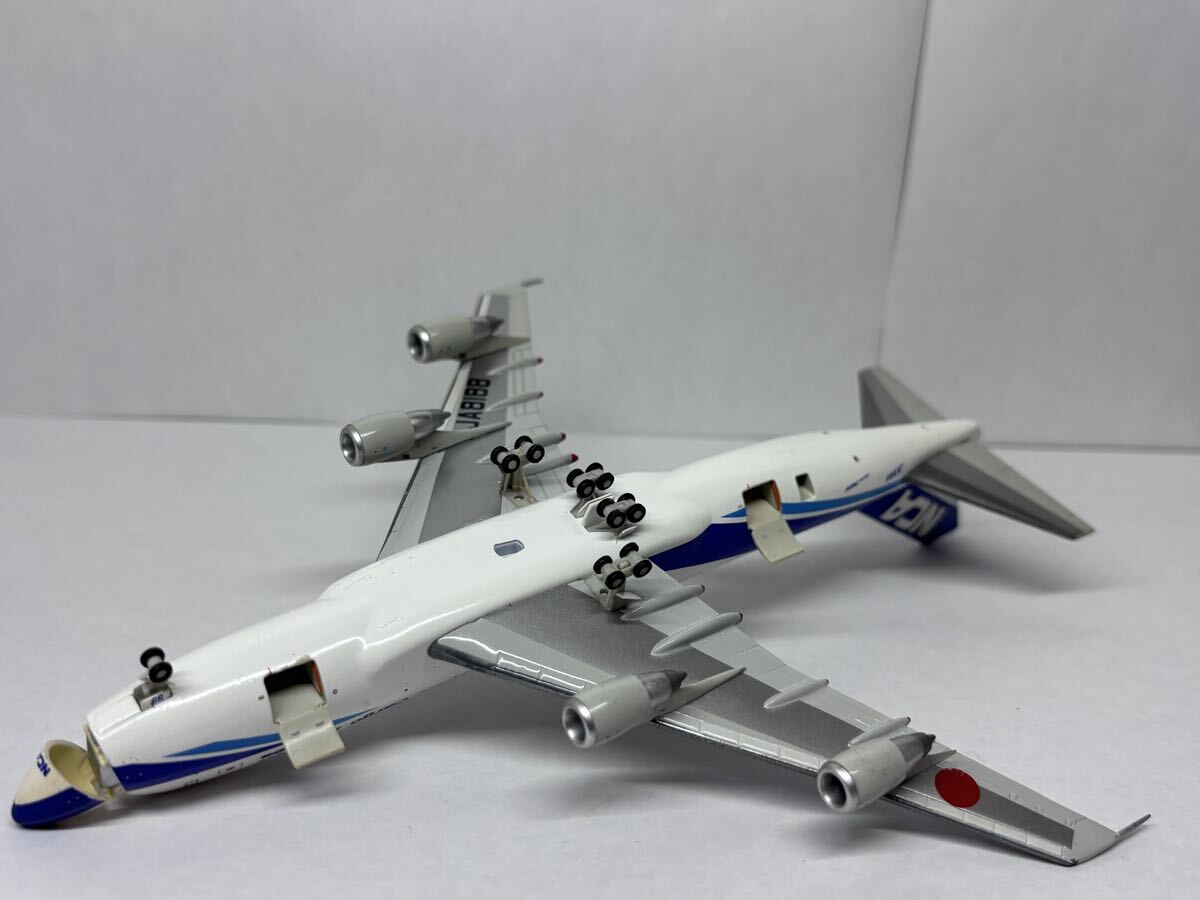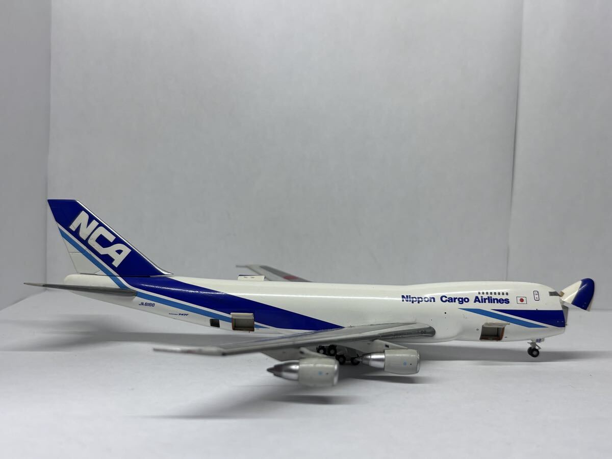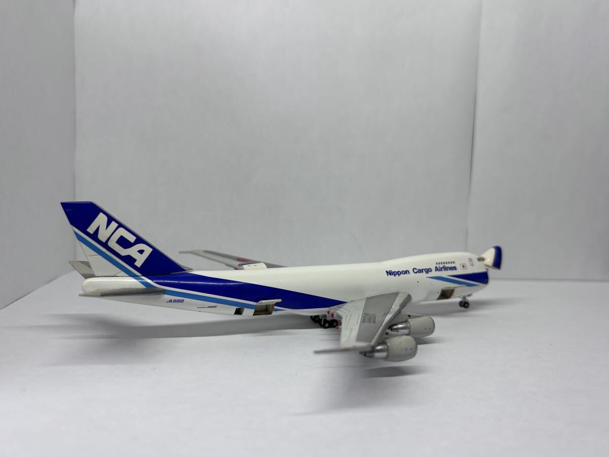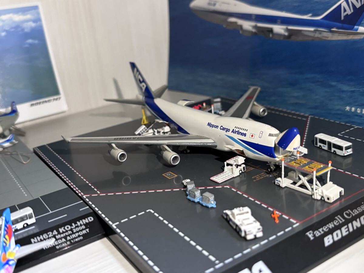 こちらは1/400 全日空商事 NCA ボーイング747-200F です。カーゴドアオープンのモデルで、本来ならGSEとジオラマプレートが付いているものですが、こちらは"本体のみ"となりますのでご注意ください。(GSEとプレートは当方保有の747SRFのもので、付属しません。)