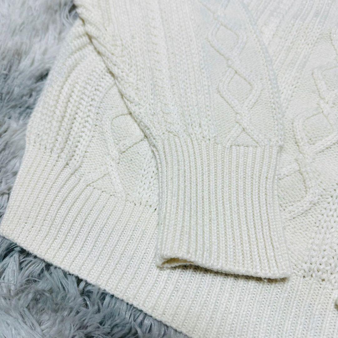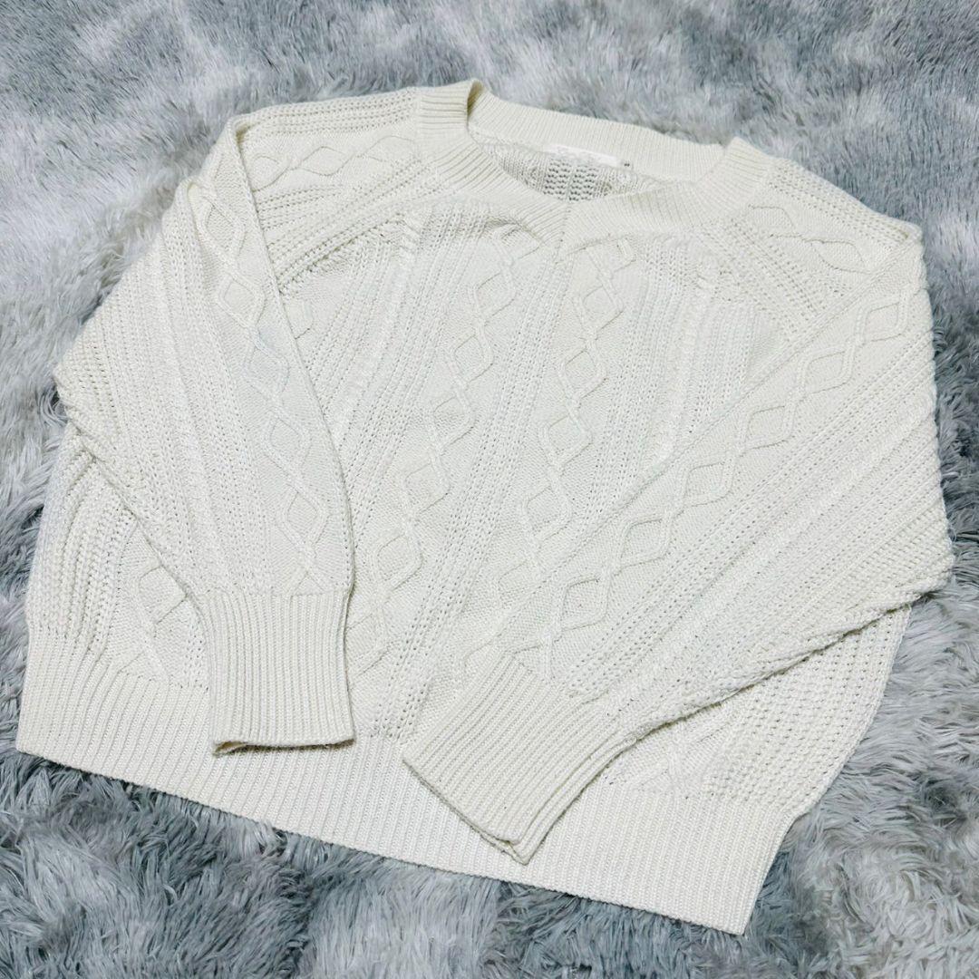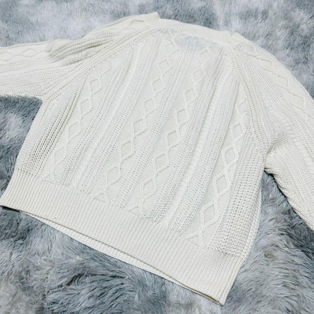 アイボリーのケーブル編みニットセーター、長袖デザインで温かみがあります。