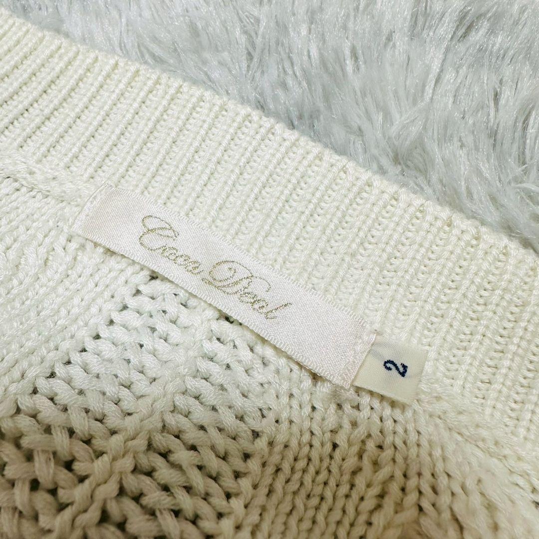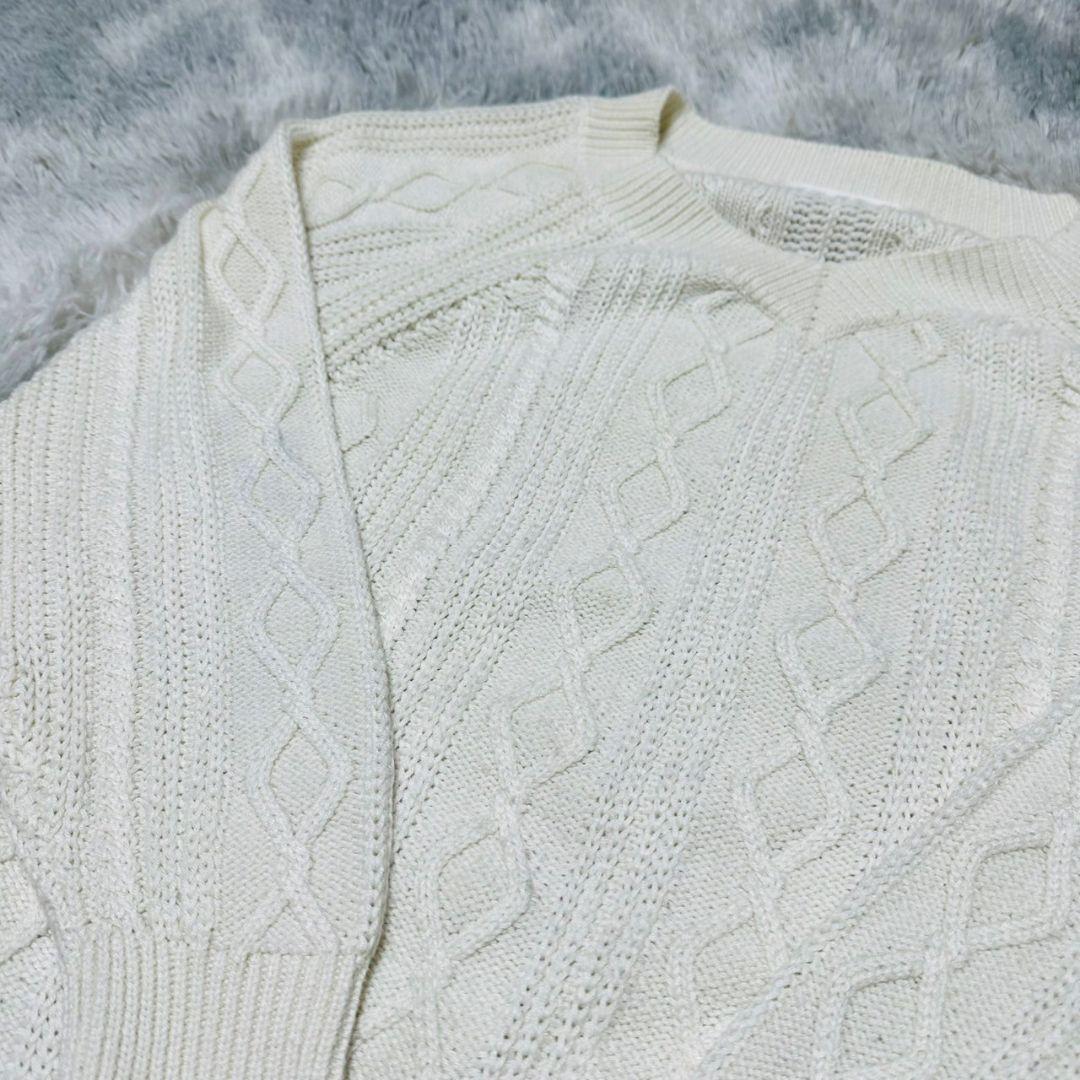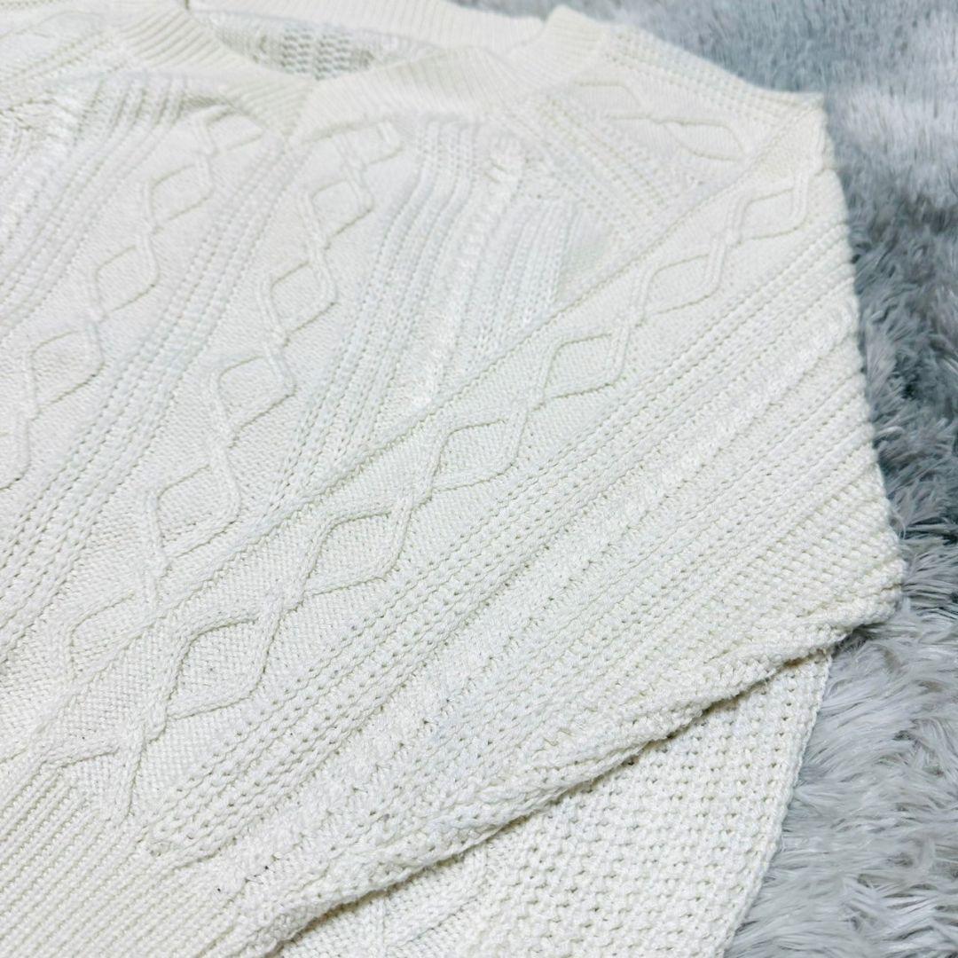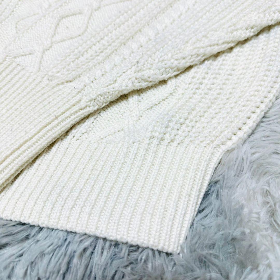 アイボリーのケーブル編みニットセーター、長袖デザインで温かみがあります。