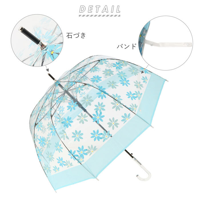 | 商品説明 | ・小鳥を包み込む鳥かごのように、優しく雨から守ってくれる・・・。amusant sous la pluie(アミュゾン・スー・ラ・プルイ)から、バードケージ・プラスティックアンブレラが新登場。(親骨65cmタイプ) ・通常の長傘よりも傘生地を深く張り、ふんわりと丸みのあるドーム型に仕上げた個性的なフォルムが特徴。 ・ポリエチレン製の透明な生地に、ヴィヴィッドな花柄やボタニカル柄を散りばめた道行く人の目を惹くアーティスティックなデザインが魅力。(※切り継ぎWH・切り継ぎSKYの2色は、クリアタイプの傘生地になります。) ・少し大きめに傘生地が広がる親骨65cmタイプなので、洋服や荷物が雨に濡れにくく、しっかりとさせるのが嬉しいポイント! ・親骨には、軽量で強い風の日もしなやかにさせるグラスファイバー素材を採用。スリムに折りたためて、持ち運びも楽ちん。 ・片手に荷物がある時や、突然の雨でもワンタッチで傘生地がサッと広げられるジャンプ式。 ・つゆ先近くを縁取る淡いカラーと透明なアクリルハンドルが、洗練された大人の女性の装いに素敵にマッチ。 |