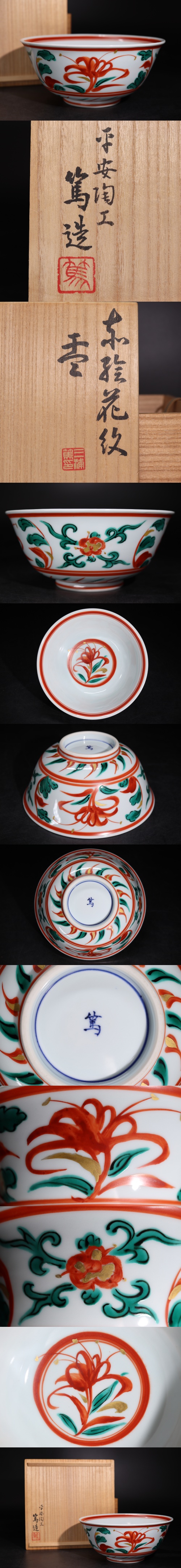 | 平安陶工 三浦篤 ( 二代 三浦竹軒 ) 造 赤絵 花紋 鉢 共箱付 / 京焼 茶器 煎茶道具 煎茶飾 .G2877 |