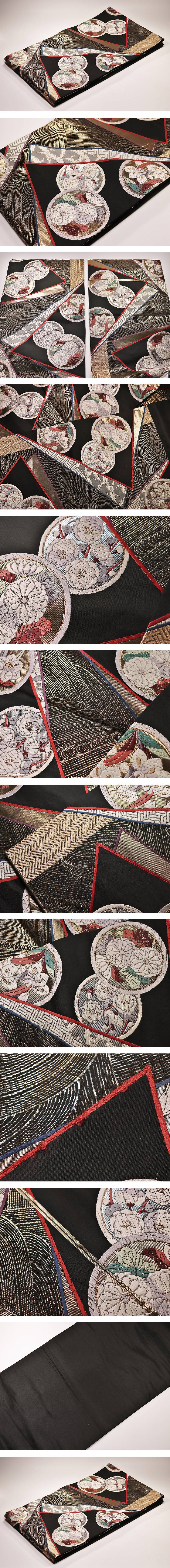 本物保証!     金銀糸刺繍小紋丸紋袋帯です。 黒地に映える金銀糸の輝きのもと、小紋に彩られ菊やアヤメ等の花々が丸紋の中に優雅に咲き誇ります。 緻密な刺繍による文様は光の角度によって繊細に表情を変え、 格調高い黒地を背景に伝統美と華やかさが感じられる袋帯です。