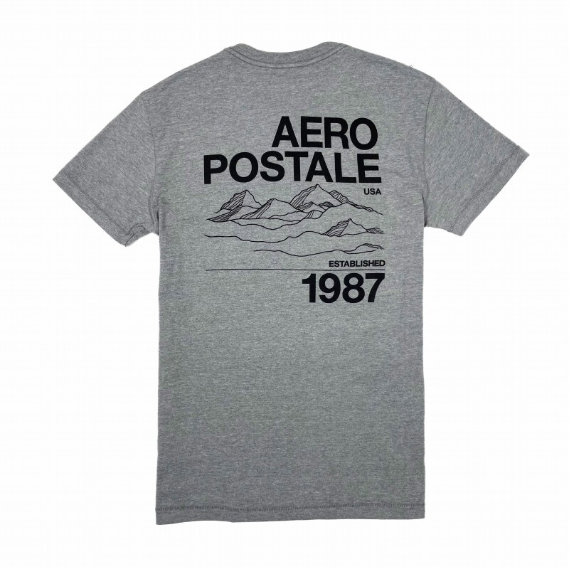 ブランドロゴと山のグラフィックをあしらったTシャツ