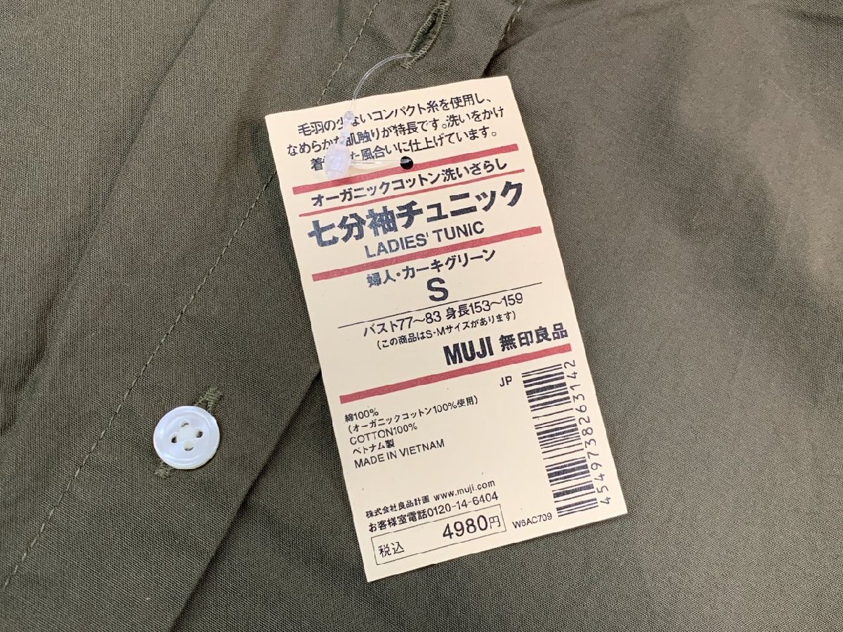 【YJ-0907】未使用 タグ付き 無印良品 オーガニックコットン 七分袖 チュニック(カーキグリーン)Sサイズ 同梱可【千円市場】