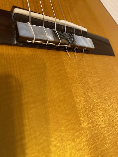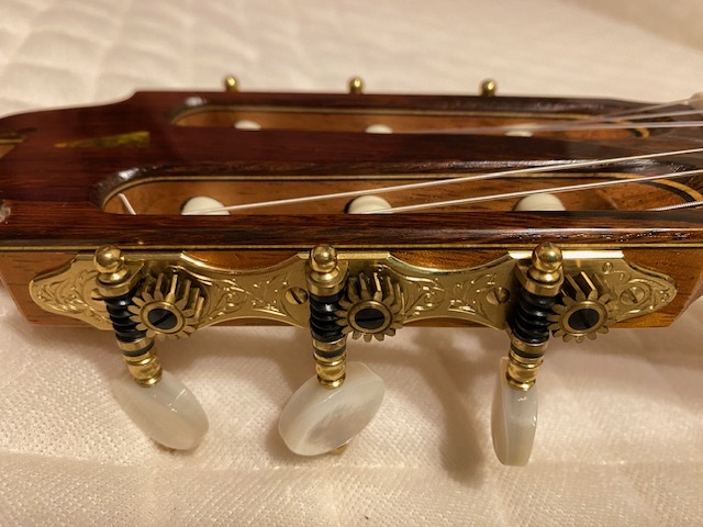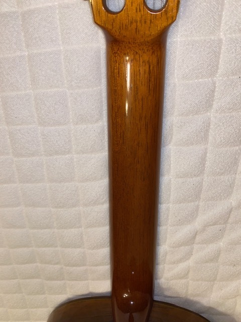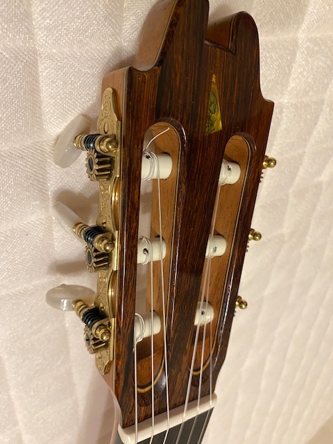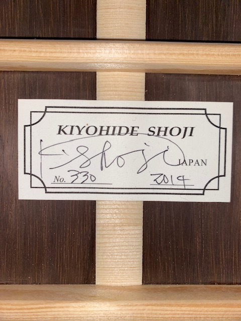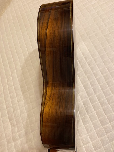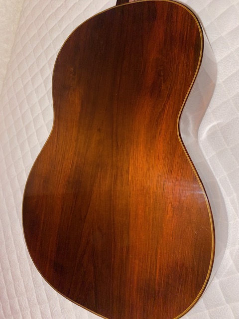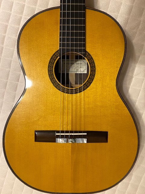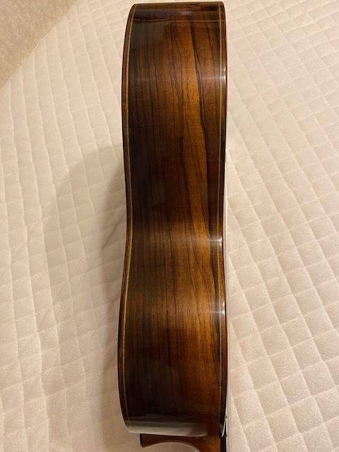 オーダー品と思われ、定価不明ですが 使用材の雰囲気や糸巻き(ロジャース)からみて 100万以上のものではないでしょうか 指板サイド5.7.10フレット位置にポジションマークが 埋め込まれています 使用感はかなり少なく、僅かな小傷があるくらいです ネックは理想的な順反り(僅か) 12フレット弦高は 6弦4ミリ、1弦3ミリ サドルの余剰はまだあります 裏板右上(胸に当たる辺り)に保護シートを 貼っていた跡がついています (どうしても画像には映りにくかったです セラック塗装表面が微かに荒れている様な感じです) 表板の1弦下にも10センチ×4センチの 同様の跡がありますが 表の方は特にわかりづらいです 弾きやすく、大変美しい音色を持っています 未使用の軽量ケースに入れて ダンボールで発送します |