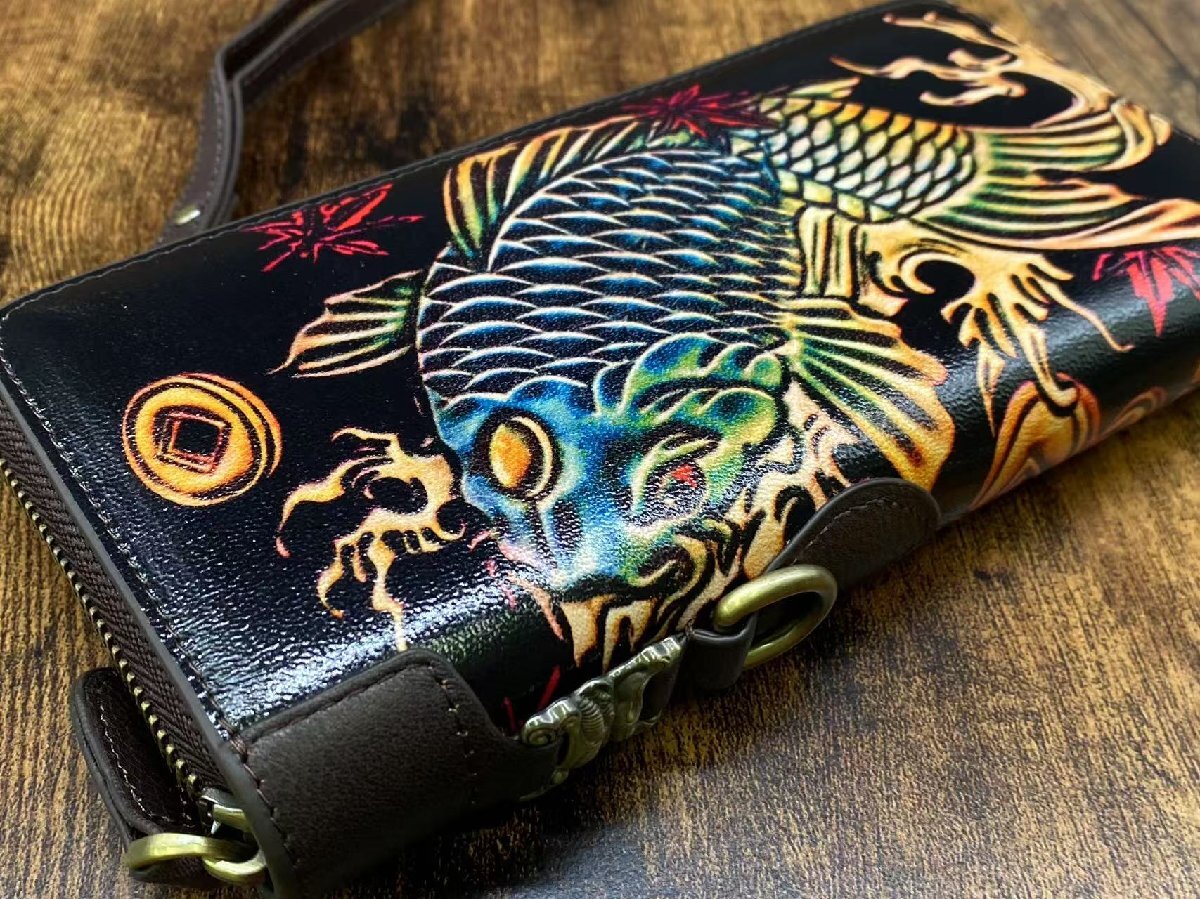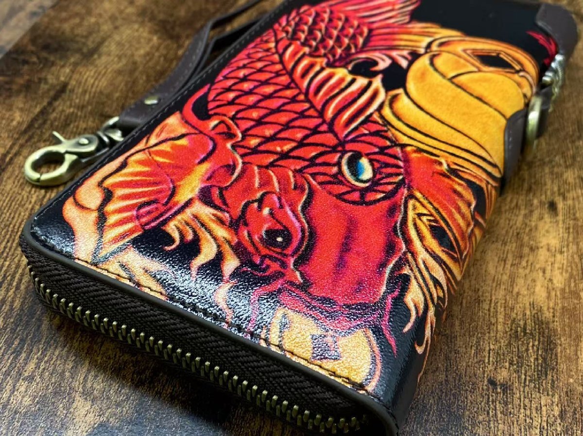 1円 新品 錦鯉 本革 長財布 牛革 ウォレット 牛ヌメ革 ラウンドファスナー 男性用財布 未使用