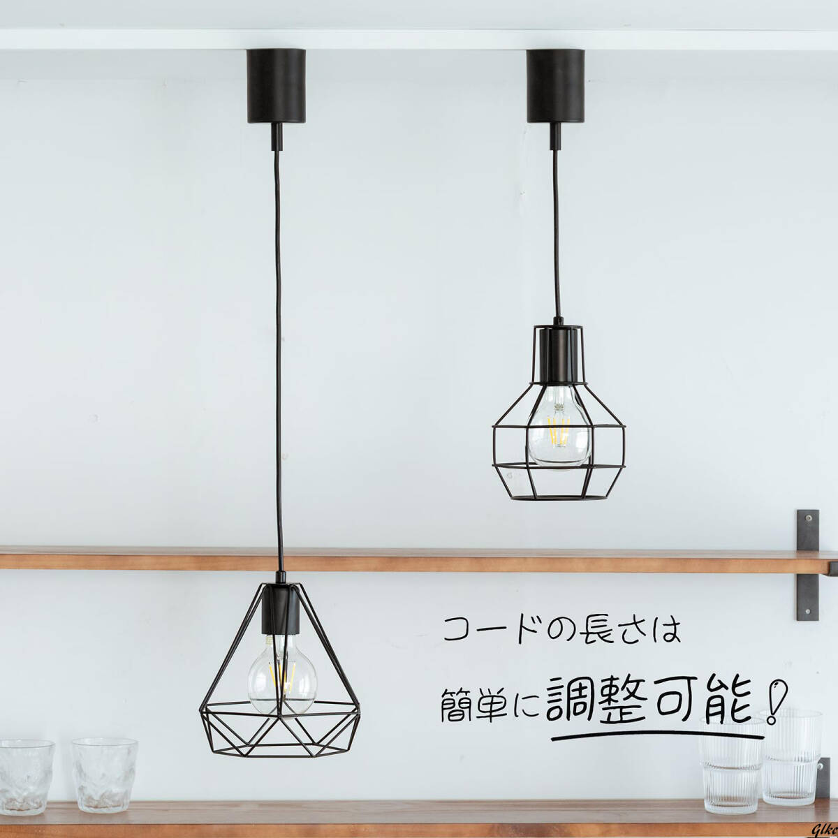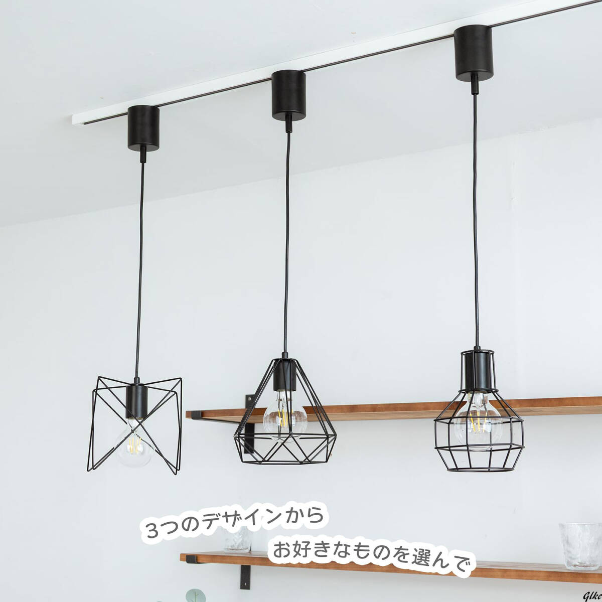 幾何学的なフォルムが印象的な、スチール製のワイヤーシェードペンダントライト。